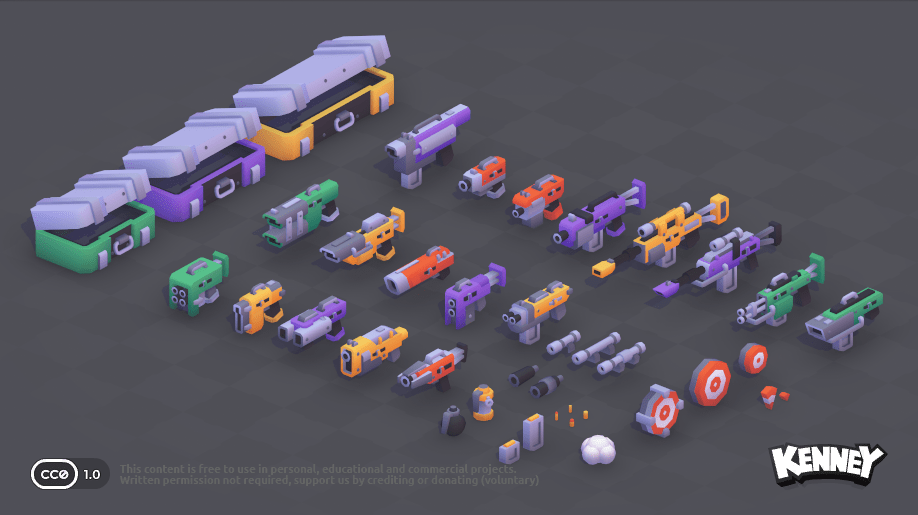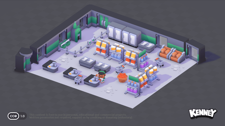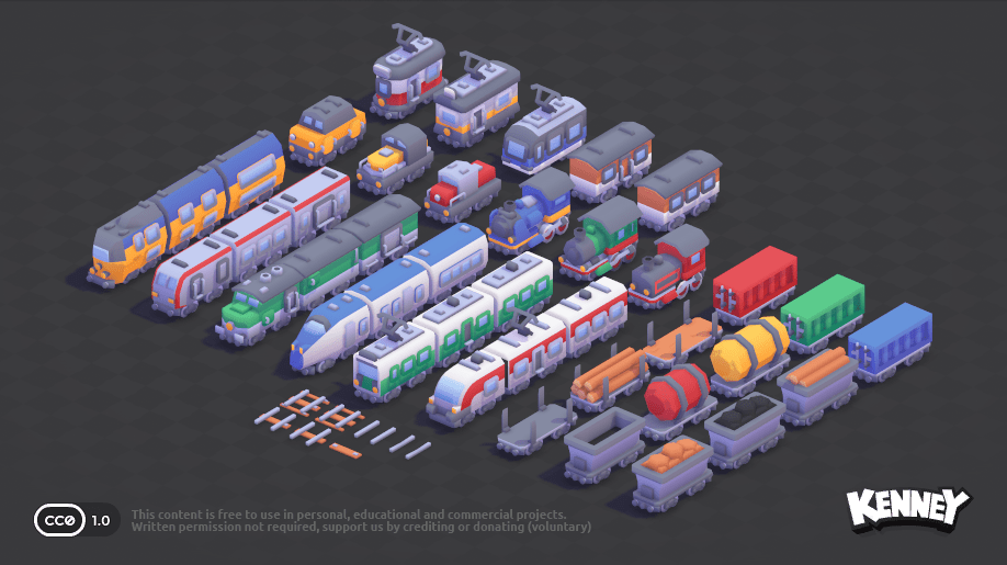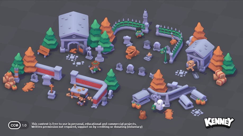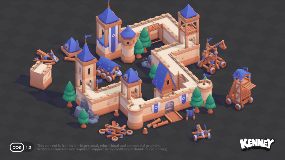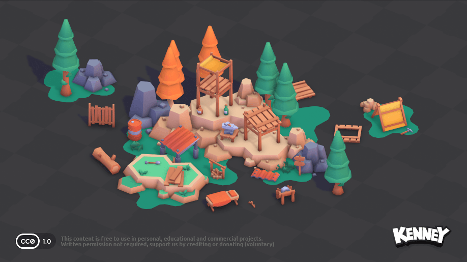 Du kannst auch 3D-Modelle in deine Szene einfügen. Auf der Website kenney.nl gibt es eine große Sammlung von kostenlosen 3D-Modellen, die du verwenden kannst. Du kannst sie direkt in dein Projekt herunterladen und in der scene.ini einfügen. Klicke dazu auf ein Kit, um die verfügbaren 3D-Modelle zu sehen: