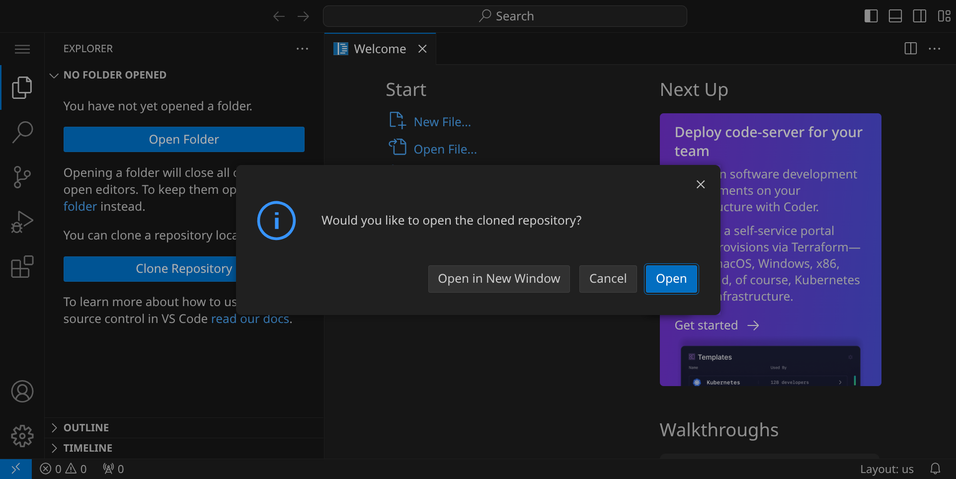 Beantworte die Frage »Would you like to open the cloned repository?« mit »Open«.