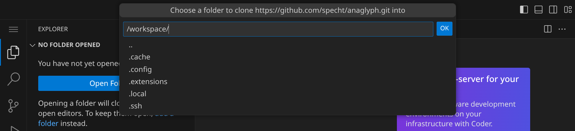 Als nächstes musst du angeben, in welches Verzeichnis du das Repository klonen möchtest. Bestätige den Standardpfad /workspace/ mit Enter.