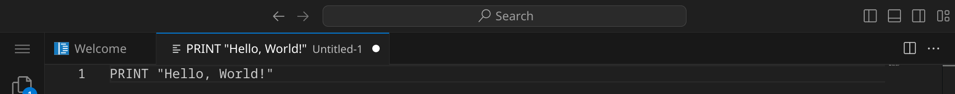 Da Visual Studio Code noch nicht weiß, dass es sich um BASIC-Quelltext handelt, ist dein Programm momentan noch einfarbig, aber das wird sich gleich ändern. An dem weißen Punkt erkennst du, dass deine Änderungen noch nicht gespeichert sind.
