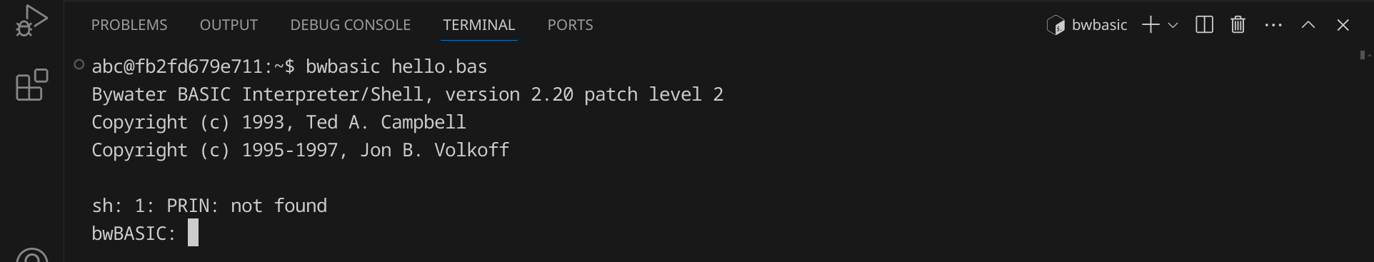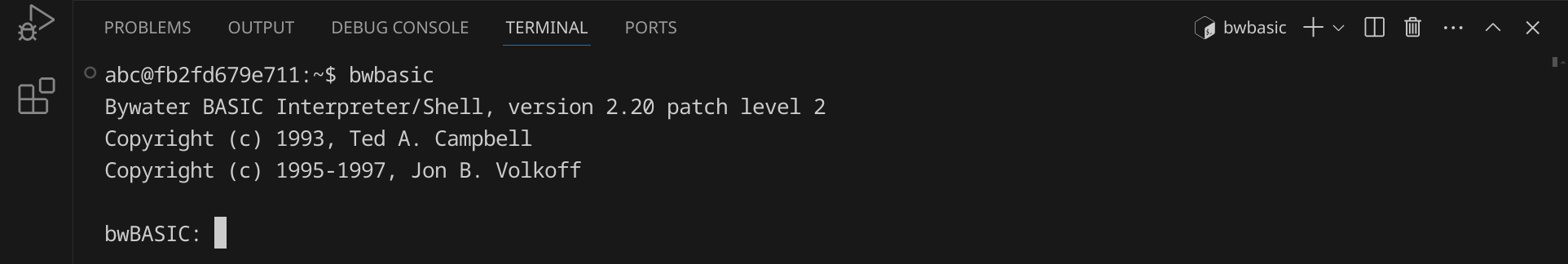 Starte nun die BASIC-Shell, indem du bwbasic eingibst und dann Enter drückst. Du solltest eine Ausgabe wie diese sehen: