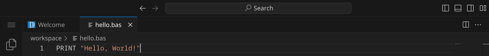 Drücke nun StrgS, um die Datei zu speichern. Gib hello.bas ein – der vollständige Pfad zu deiner Datei lautet dann /workspace/hello.bas.
