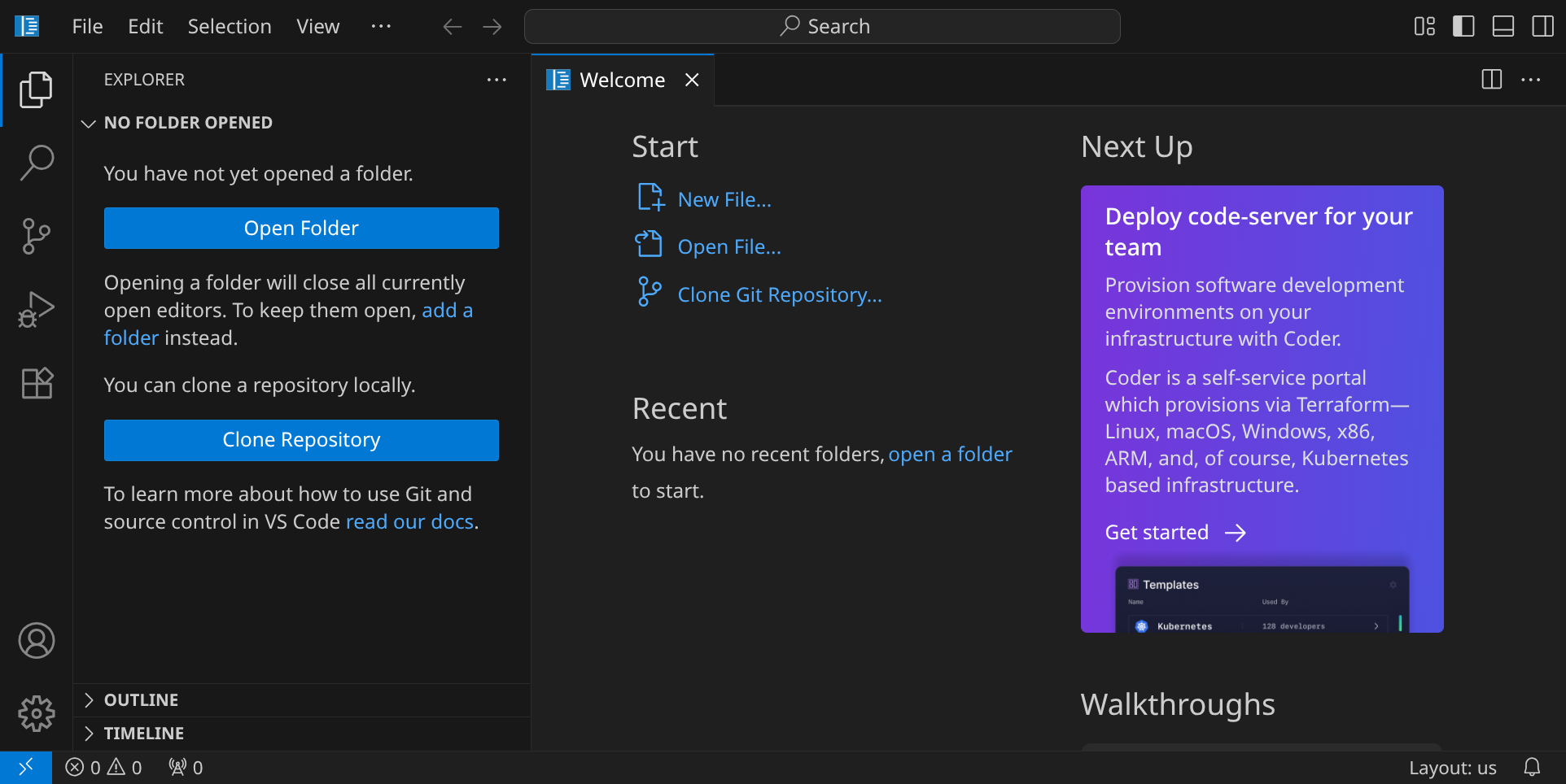 Wenn du den Workspace öffnest, siehst du die Entwicklungsumgebung Visual Studio Code: