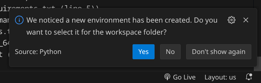 Wenn du zwischendurch diesen Hinweis siehst (s. oben rechts), kannst du mit »Yes« antworten, da wir die frisch eingerichtete Python-Umgebung in diesem Verzeichnis verwenden wollen.