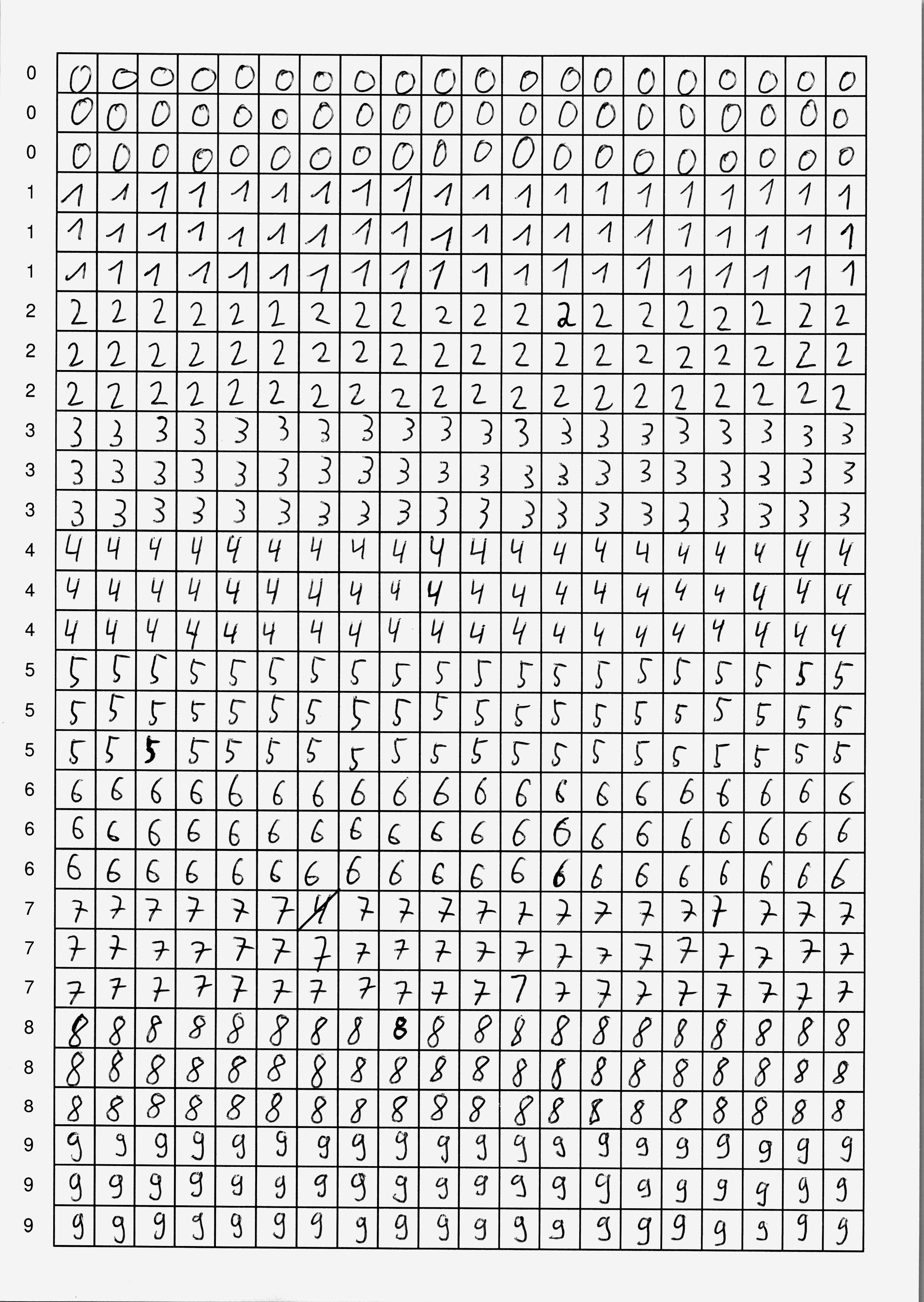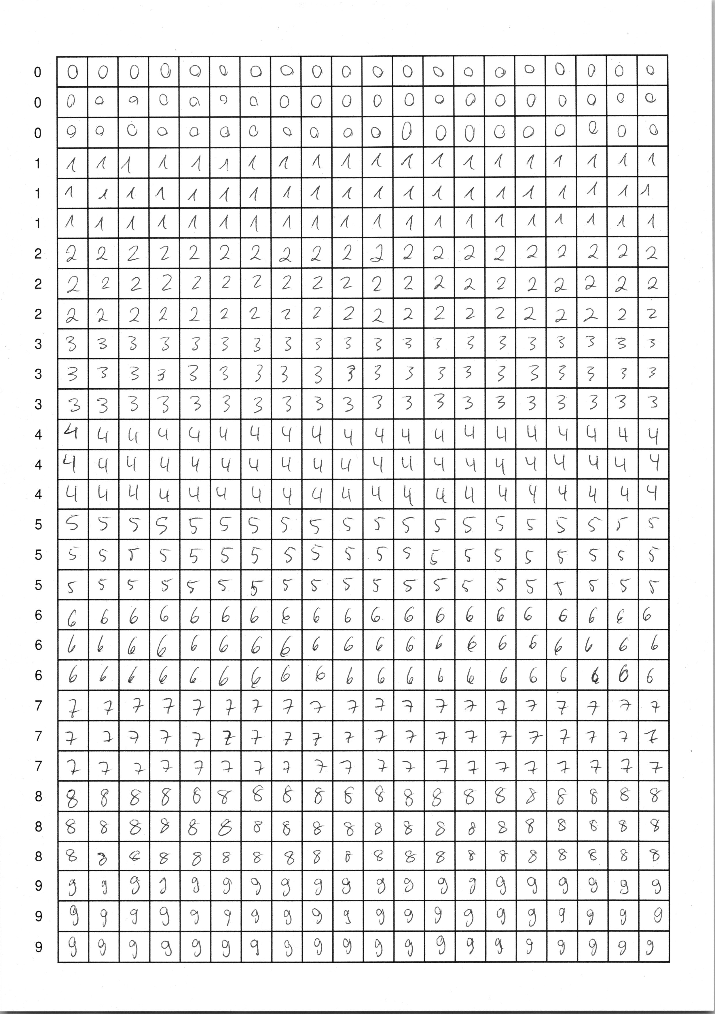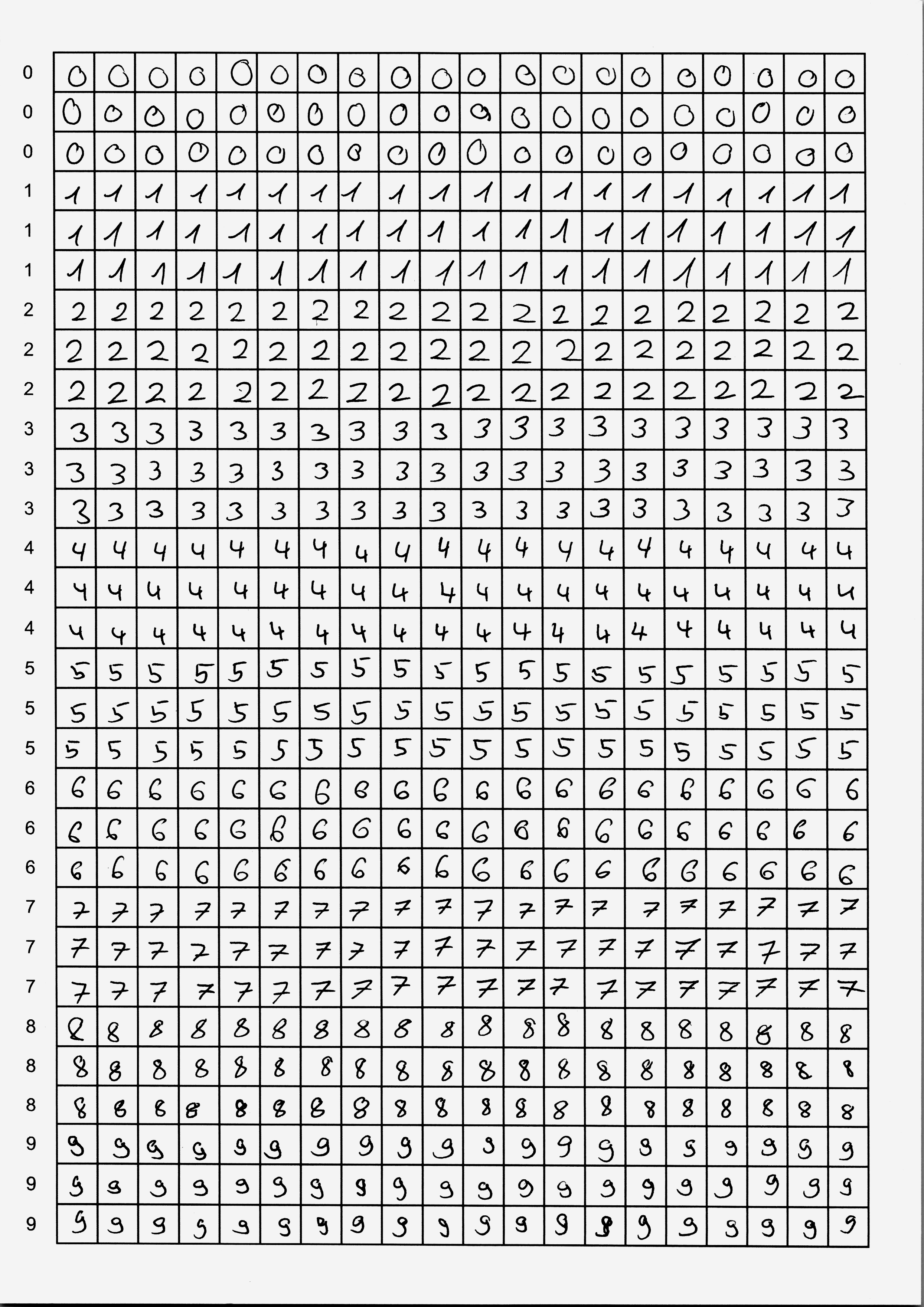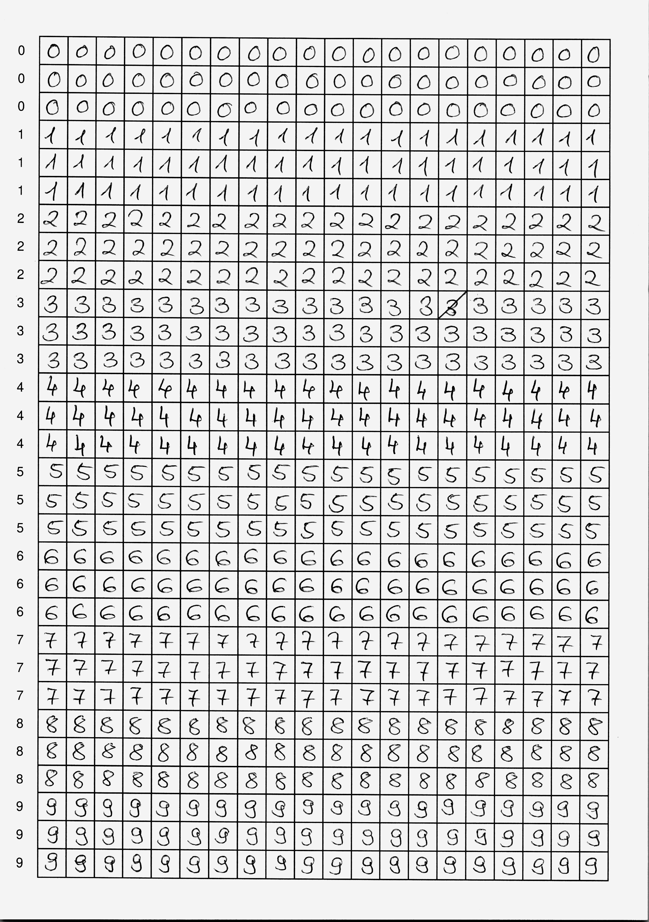 Du hast nun zwei Möglichkeiten: entweder verwendest du fertige Scans mit handgeschriebenen Ziffern, oder du schreibst selbst Ziffern – das ist natürlich viel spannender, weil du in diesem Fall dein neuronales Netzwerk mit deinen eigenen Daten trainieren wirst. In jedem Fall brauchst du mindestens zwei Seiten mit handgeschriebenen Ziffern als Trainingsmaterial.