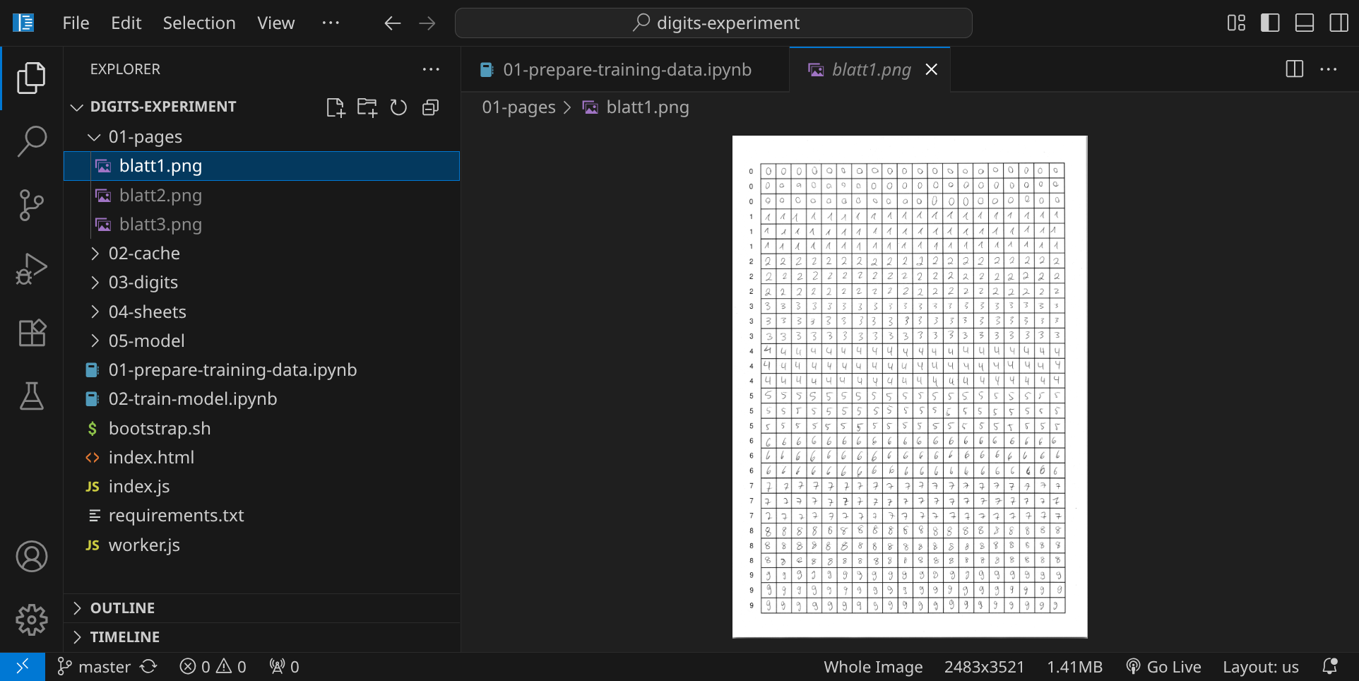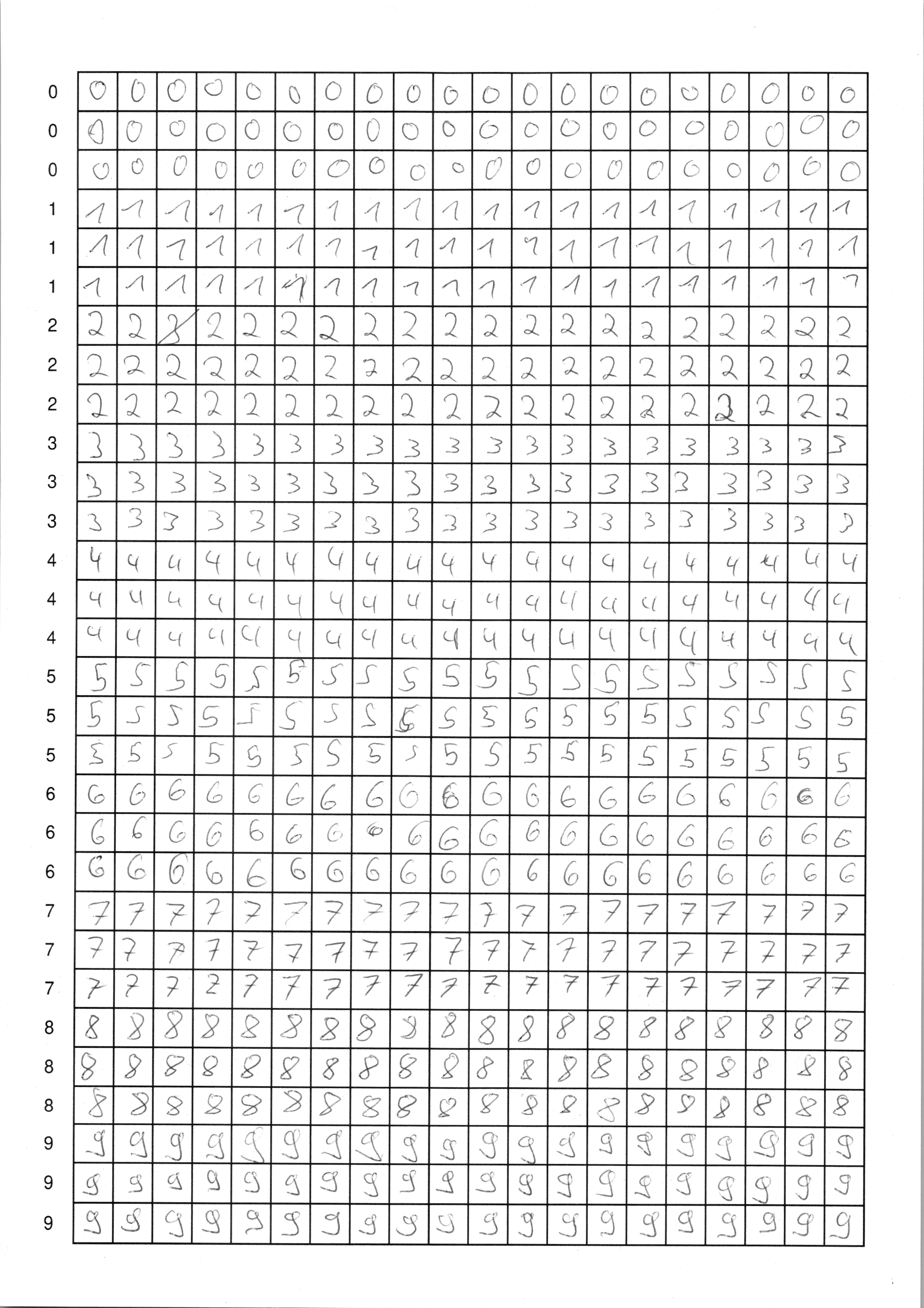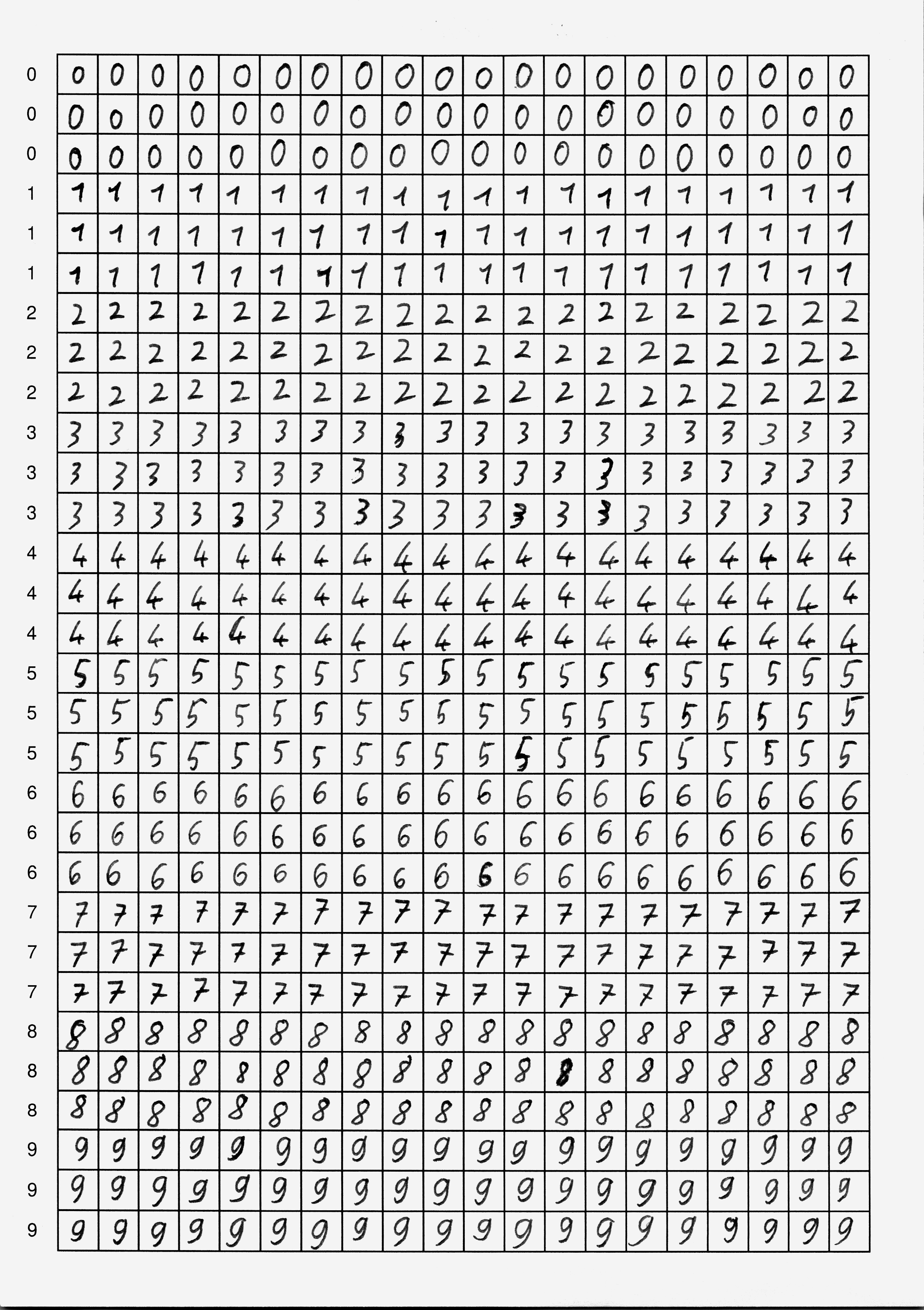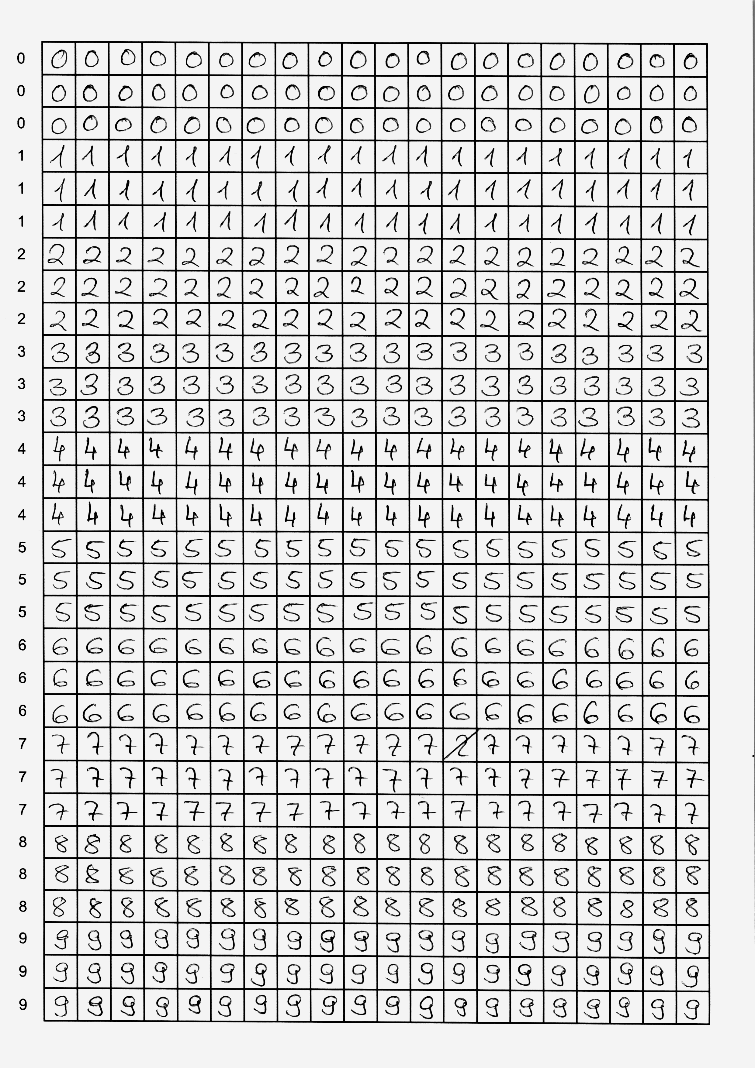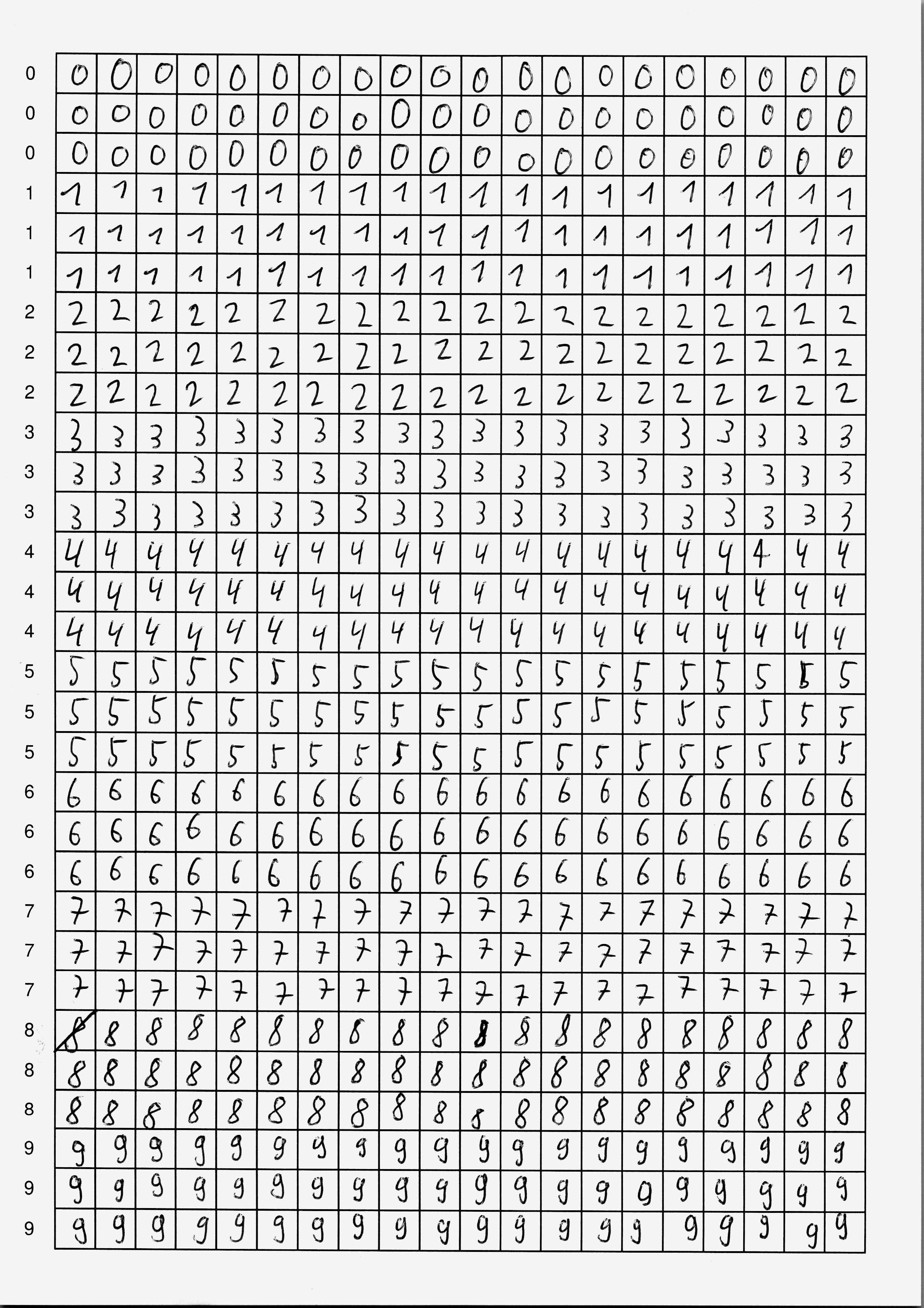 Du hast nun zwei Möglichkeiten: entweder verwendest du fertige Scans mit handgeschriebenen Ziffern, oder du schreibst selbst Ziffern – das ist natürlich viel spannender, weil du in diesem Fall dein neuronales Netzwerk mit deinen eigenen Daten trainieren wirst. In jedem Fall brauchst du mindestens zwei Seiten mit handgeschriebenen Ziffern als Trainingsmaterial.