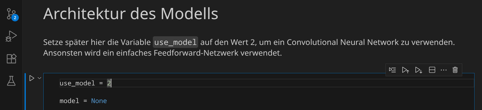 Um ein CNN zu verwenden, scrolle nach oben zum Abschnitt »Architektur des Modells« und setze die Variable use_model auf den Wert 2. Führe dann diesen und alle folgenden Codeblöcke erneut aus.