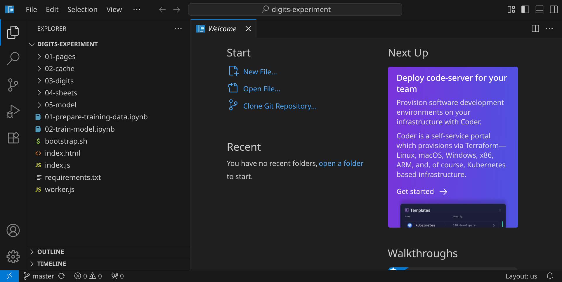 Stelle zuerst sicher, dass du keinen Ordner geöffnet hast. Um sicherzugehen, drücke einfach den Shortcut für »Ordner schließen«: StrgK und dann F. Drücke StrgShiftE, um die Seitenleiste mit dem Explorer-Tab zu öffnen. Dein Workspace sollte jetzt ungefähr so aussehen: