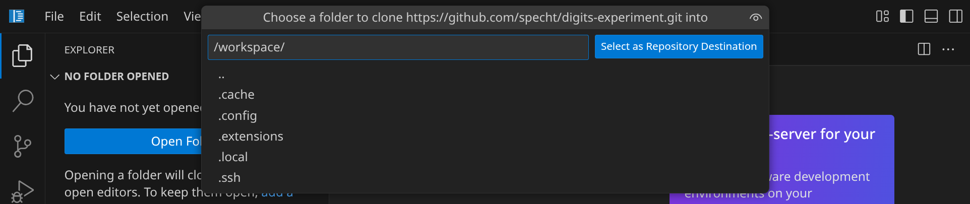 Als nächstes musst du angeben, in welches Verzeichnis du das Repository klonen möchtest. Bestätige den Standardpfad /workspace/ mit Enter.