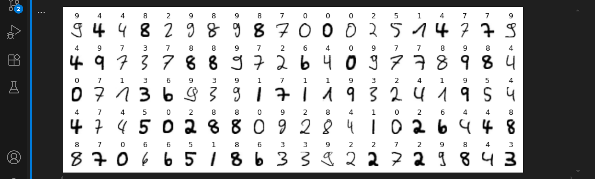 Öffne nun das zweite Jupyter-Notebook 02-train-model.ipynb, indem du darauf klickst. Es enthält den Code, um unser neuronales Netzwerk zu trainieren, das die handgeschriebenen Ziffern erkennen soll. Im ersten Schritt wird die Menge aller Trainingsdaten in drei Teile aufgeteilt: 80% für das Training, 10% für die Validierung und 10% für den Test.