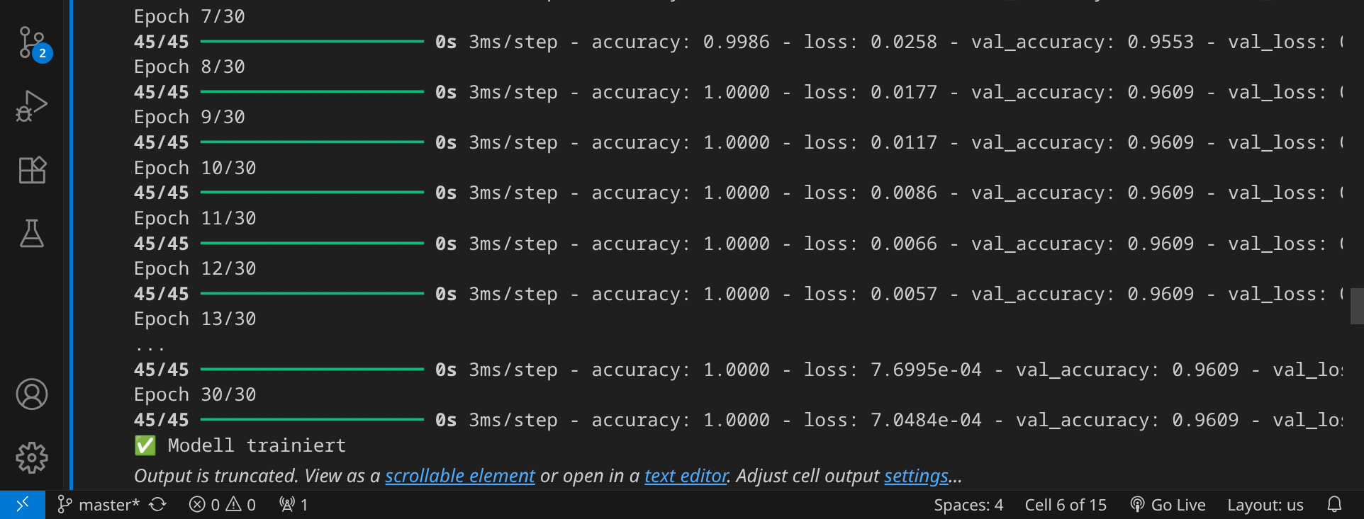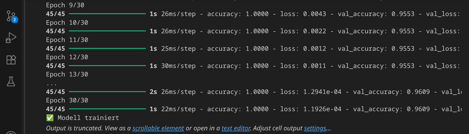 Wir sind jetzt bereit, das Modell zu trainieren. Klicke auf das Play-Symbol, um den Codeblock auszuführen. Nach 30 Trainingsepochen ist das Training beendet.