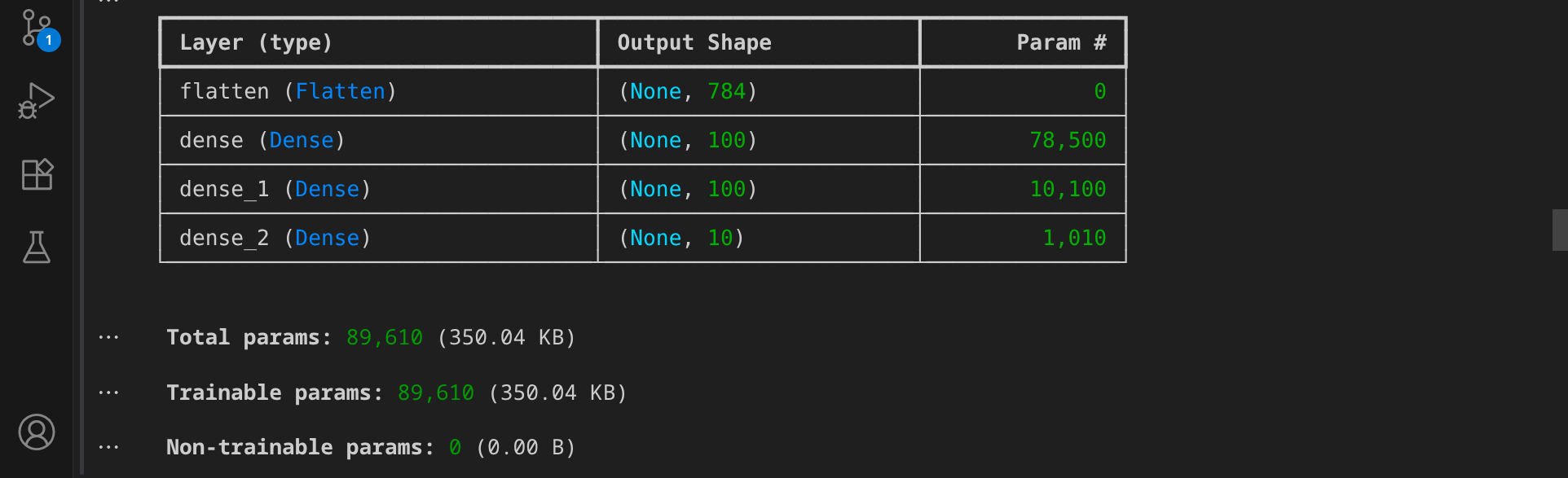 Dieses Modell verfügt über eine Gesamtzahl von 89.610 Parametern, die während des Trainings optimiert werden.