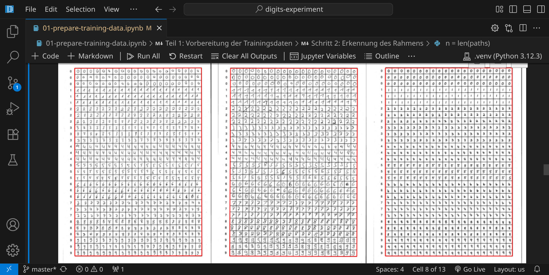 Wenn das Ergebnis zufriedenstellend aussieht, führe den nächsten Codeblock aus. In diesem Schritt werden die einzelnen Ziffern aus den Bildern ausgeschnitten: