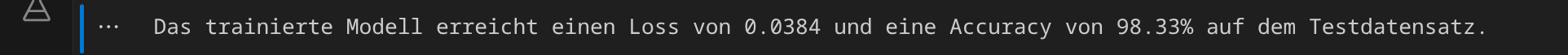 Jetzt ermitteln wir, wie gut das Modell ist. Dazu verwenden wir die Testdaten, die wir zuvor beiseite gelegt haben. Die wichtigen Kennwerte sind der Verlust (loss) und die Genauigkeit (accuracy):