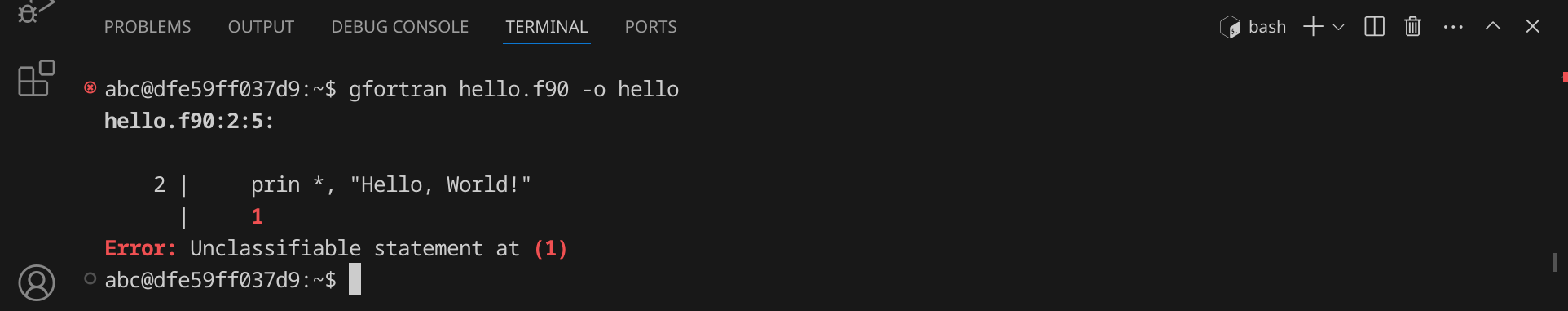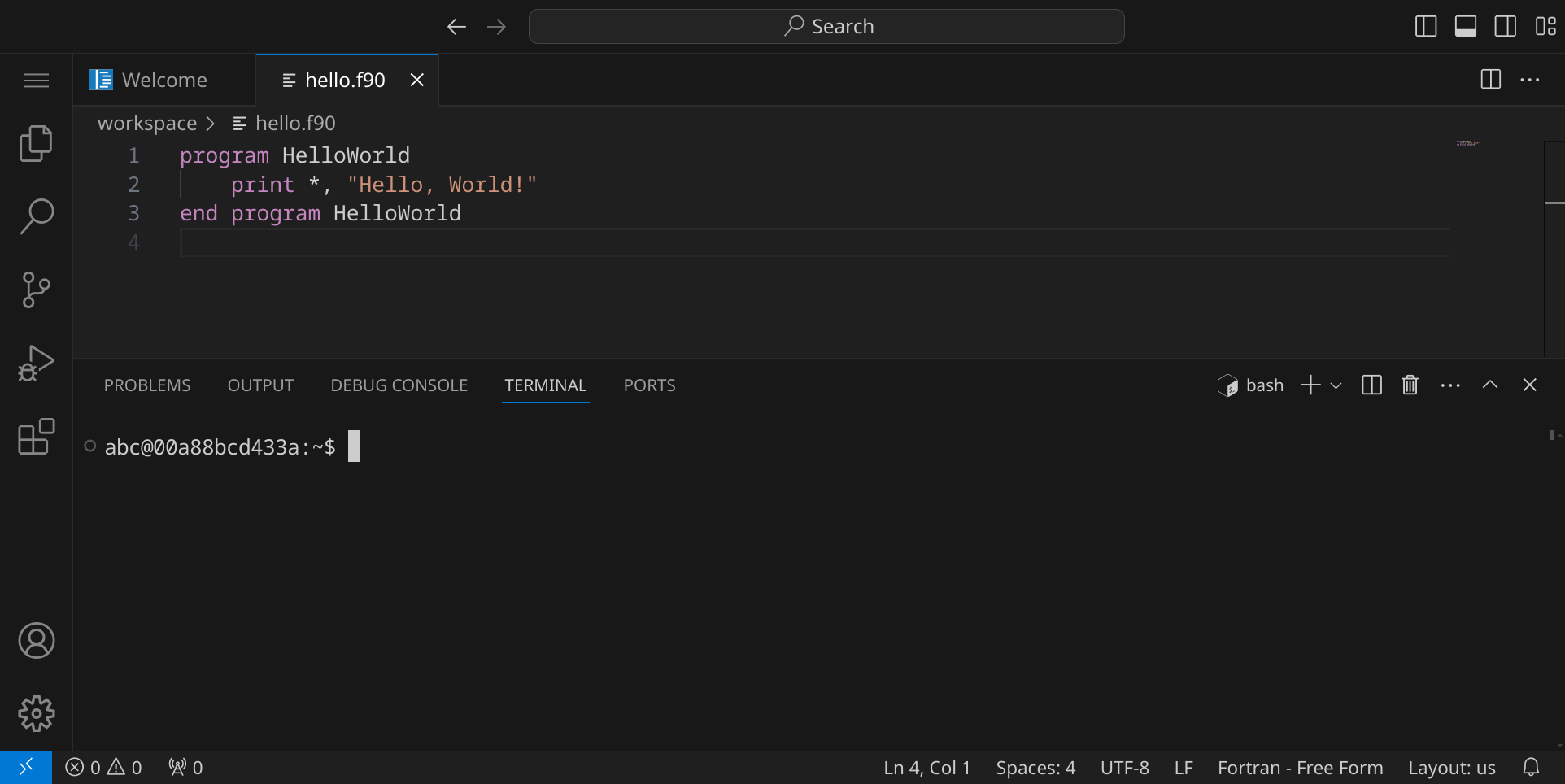 Drücke nun StrgS, um die Datei zu speichern. Gib hello.f90 ein – der vollständige Pfad zu deiner Datei lautet dann /workspace/hello.f90.