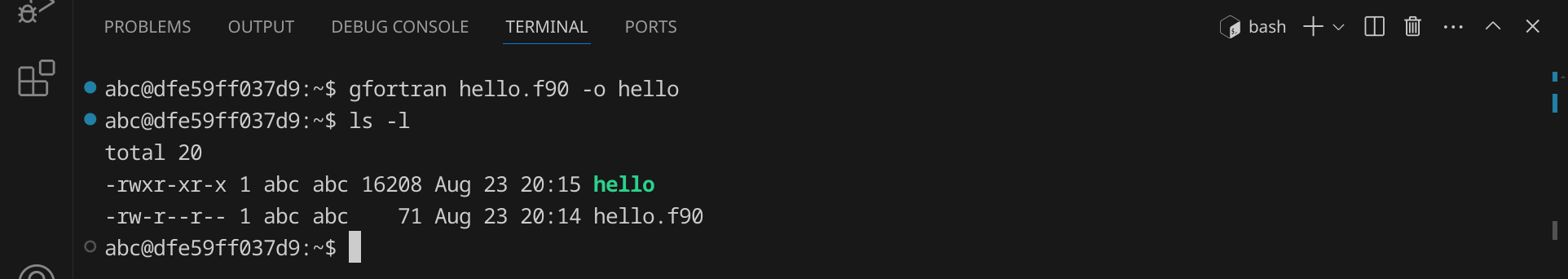 Wenn du keinen Fehler gemacht hast, wird das Programm erfolgreich kompiliert und die ausführbare Datei hello wird im selben Verzeichnis erstellt. Du kannst dies überprüfen, indem du dir die Dateien im aktuellen Verzeichnis mit ls oder ls -l anzeigen lässt: