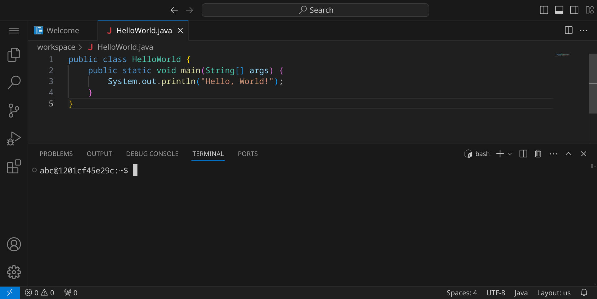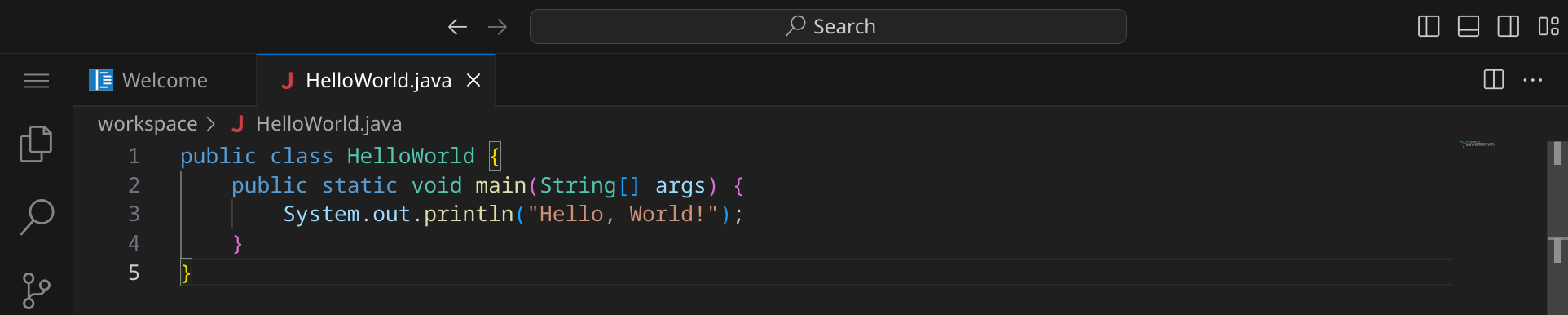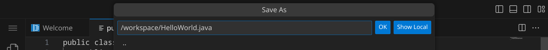 Drücke nun StrgS, um die Datei zu speichern. Gib HelloWorld.java ein – der vollständige Pfad zu deiner Datei lautet dann /workspace/HelloWorld.java.