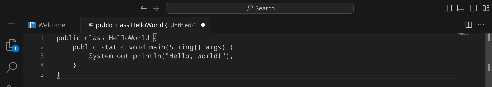 Da Visual Studio Code noch nicht weiß, dass es sich um Java-Quelltext handelt, ist dein Programm momentan noch einfarbig, aber das wird sich gleich ändern. An dem weißen Punkt erkennst du, dass deine Änderungen noch nicht gespeichert sind.