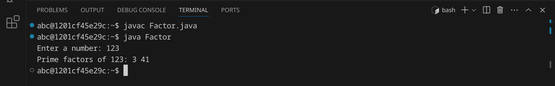 Speichere die Datei unter dem Namen Factor.java. Kompiliere das Programm: