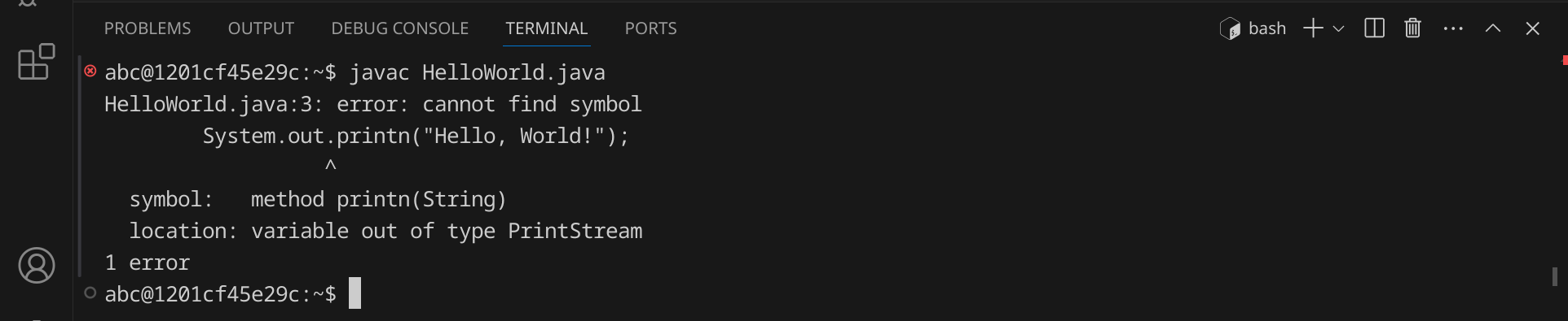 Wenn du einen Fehler im Code machst, wird der Compiler eine Fehlermeldung ausgeben. Versuche zum Beispiel, statt println das Wort printn zu schreiben: