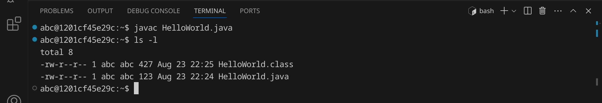 Wenn du keinen Fehler gemacht hast, wird das Programm erfolgreich kompiliert und die Datei HelloWorld.class wird im selben Verzeichnis erstellt. Du kannst dies überprüfen, indem du dir die Dateien im aktuellen Verzeichnis mit ls oder ls -l anzeigen lässt: