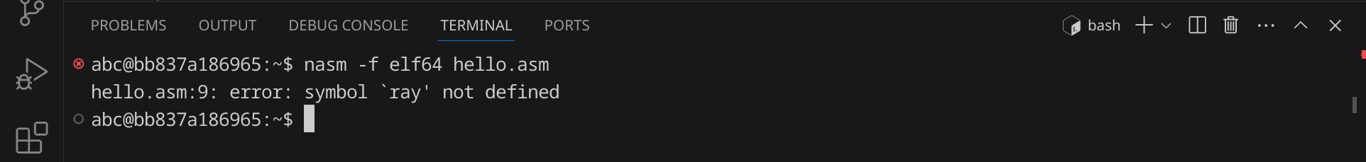Wenn du einen Fehler im Code machst, wird der Compiler eine Fehlermeldung ausgeben. Versuche zum Beispiel, in Zeile 9 statt rax das Wort ray zu schreiben: