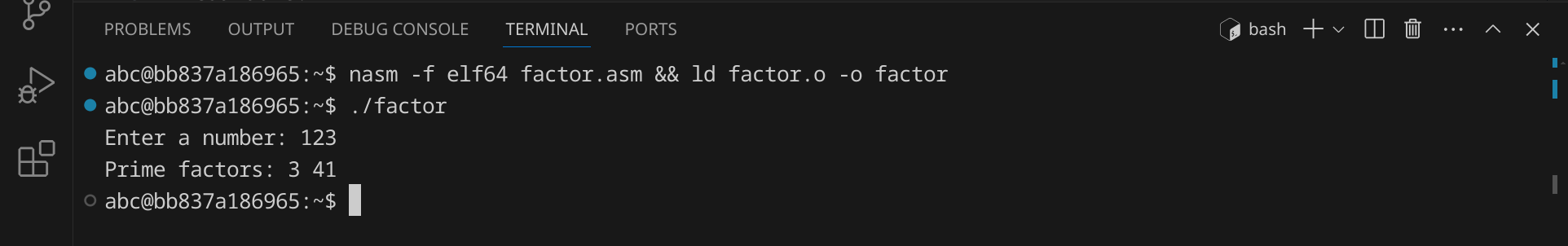 nasm -f elf64 factor.asm && ld factor.o -o factor
