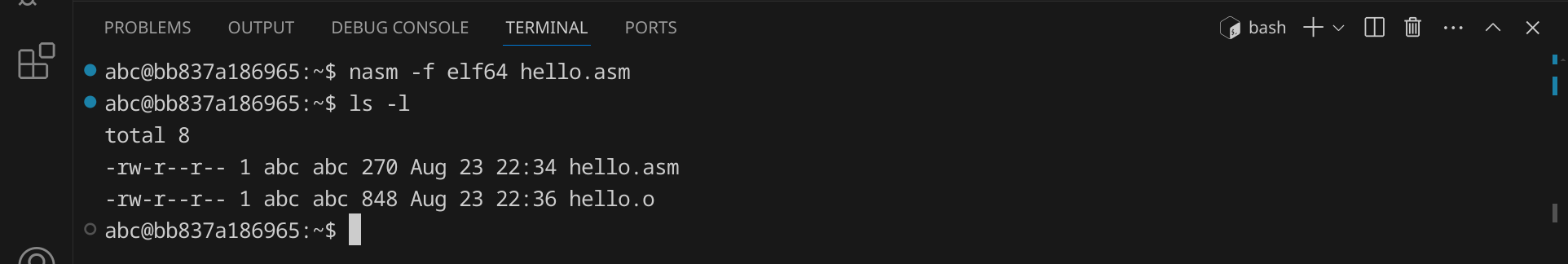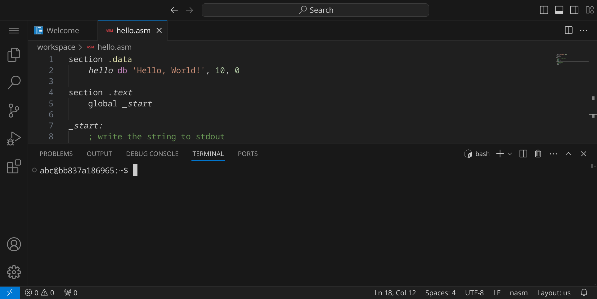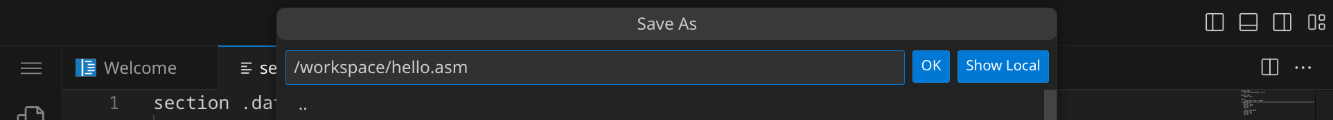 Drücke nun StrgS, um die Datei zu speichern. Gib hello.asm ein – der vollständige Pfad zu deiner Datei lautet dann /workspace/hello.asm.