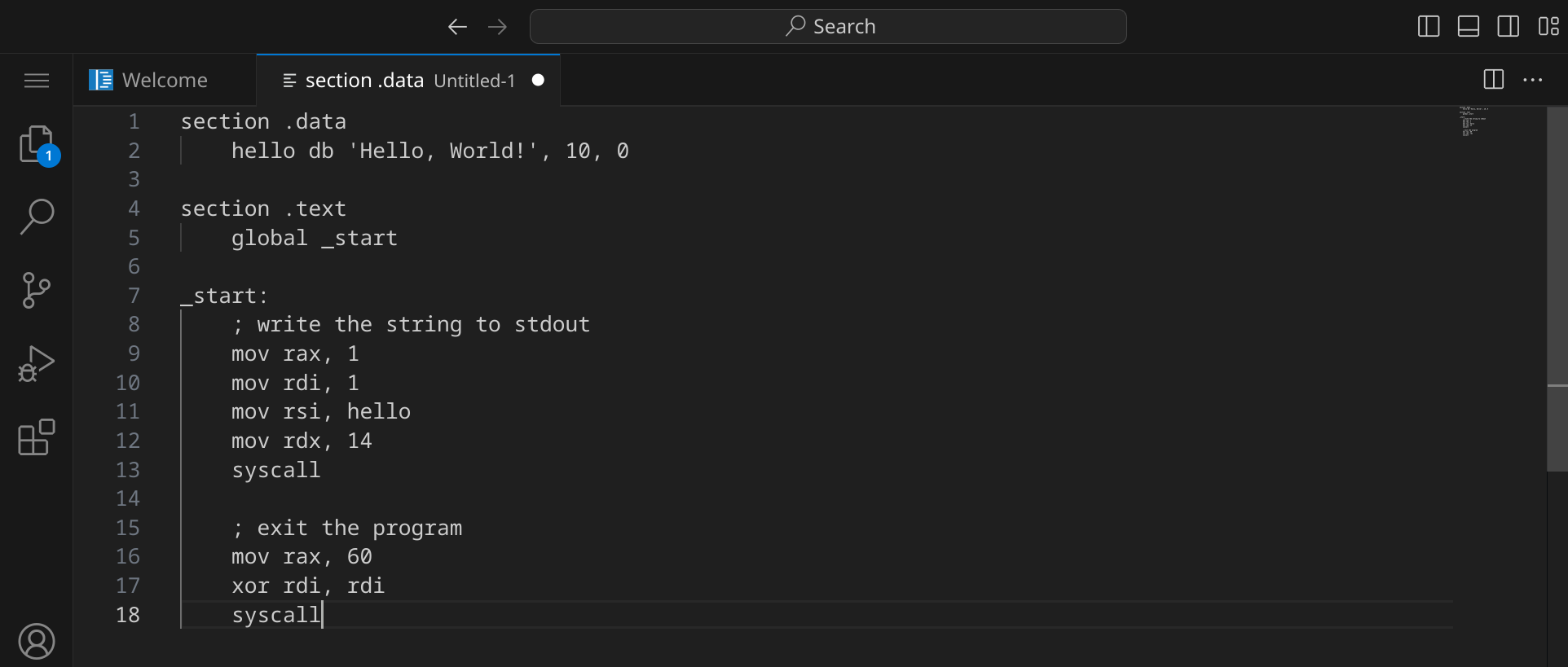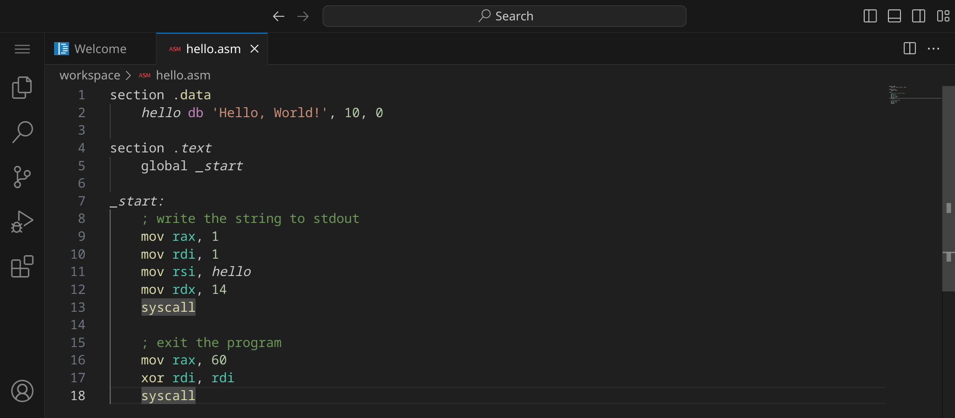 section .data hello db 'Hello, World!', 10, 0 section .text global _start _start: ; write the string to stdout mov rax, 1 mov rdi, 1 mov rsi, hello mov rdx, 14 syscall ; exit the program mov rax, 60 xor rdi, rdi syscall |