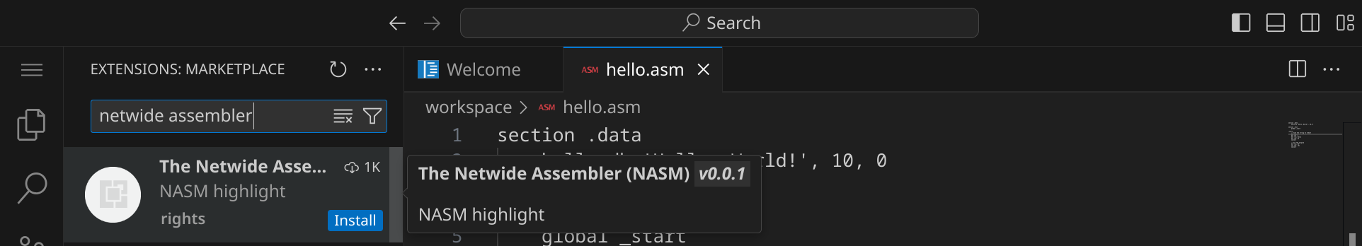 in der Seitenleiste oder drücke StrgShiftX. Suche nach der Erweiterung »The Netwide Assembler« und installiere sie.