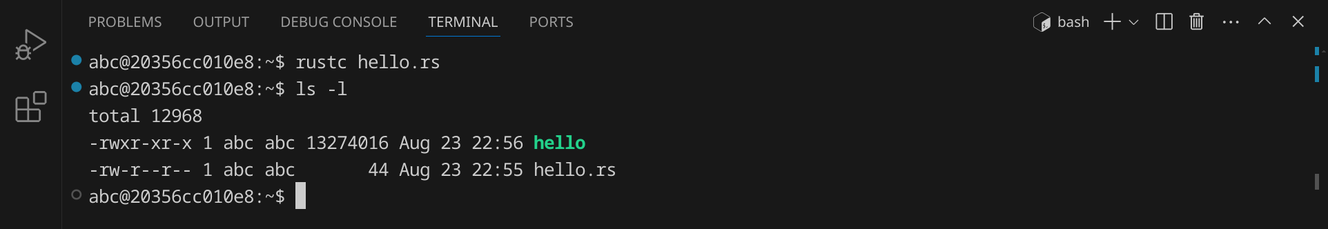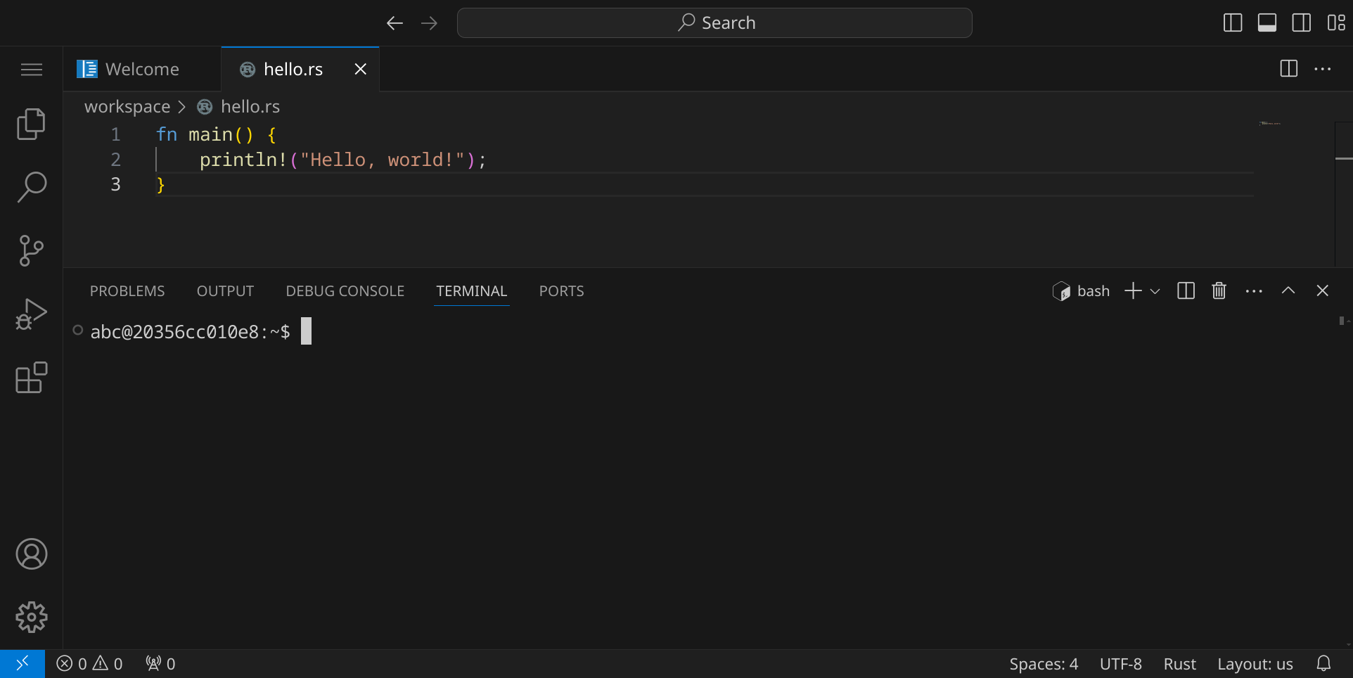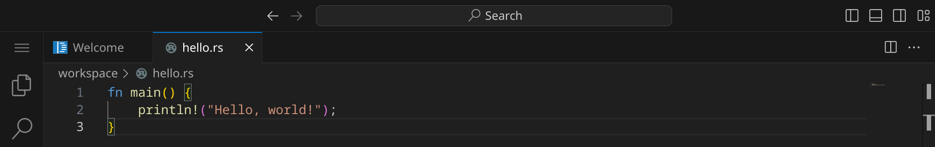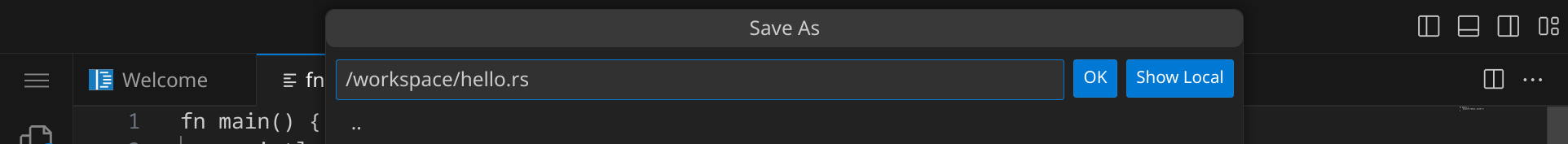 Drücke nun StrgS, um die Datei zu speichern. Gib hello.rs ein – der vollständige Pfad zu deiner Datei lautet dann /workspace/hello.rs.