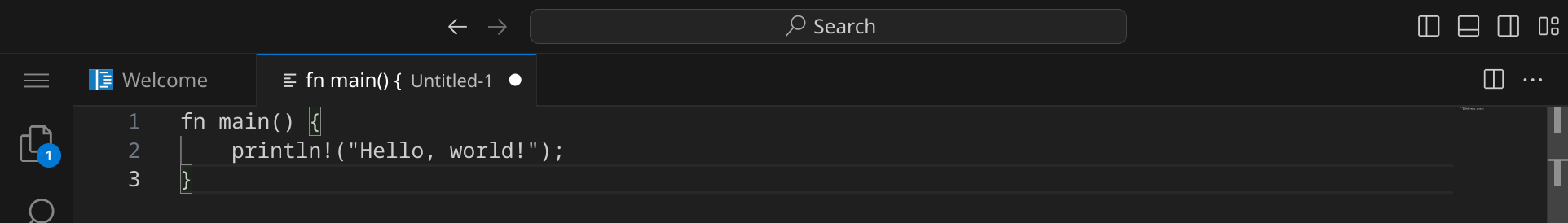 Da Visual Studio Code noch nicht weiß, dass es sich um Rust-Quelltext handelt, ist dein Programm momentan noch einfarbig, aber das wird sich gleich ändern. An dem weißen Punkt erkennst du, dass deine Änderungen noch nicht gespeichert sind.