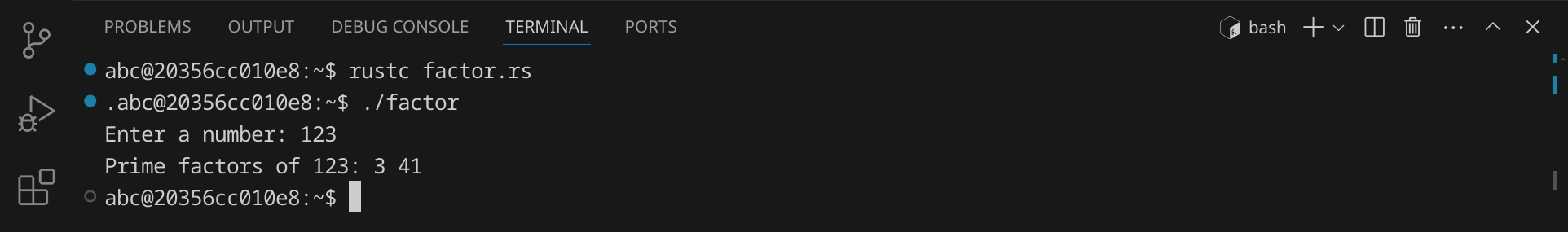 Speichere die Datei unter dem Namen factor.rs. Kompiliere das Programm: