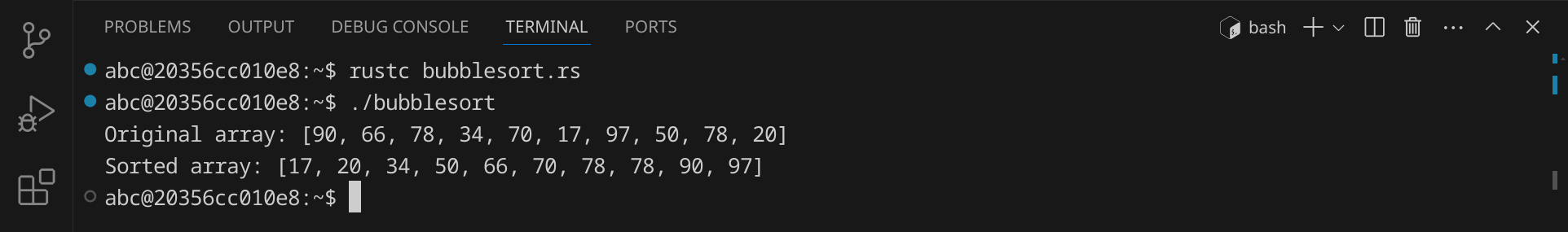 Speichere die Datei unter dem Namen bubblesort.rs. Kompiliere das Programm: