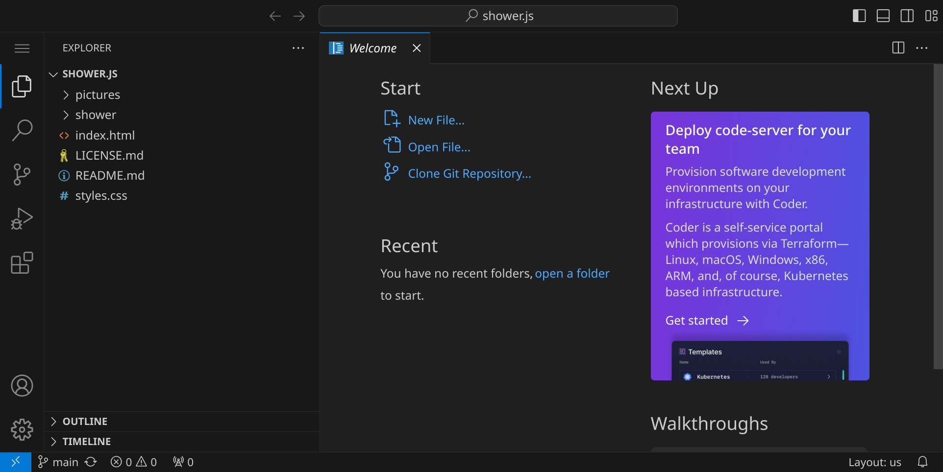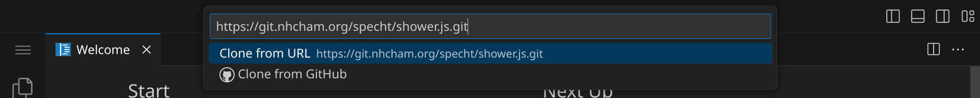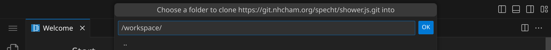 Das Repository wird jetzt ins Verzeichnis /workspace/shower.js geklont. Öffne anschließend das Verzeichnis, indem du die Frage,
