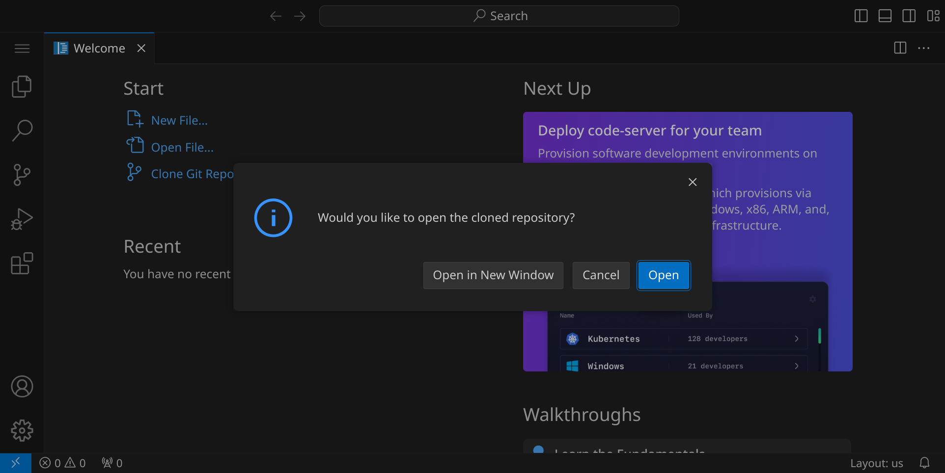 ob das Repository jetzt geöffnet werden soll, mit »Open« beantwortest:
