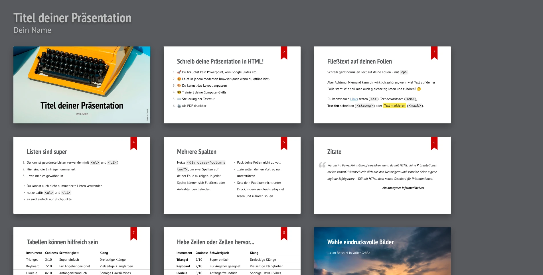 Schau dir die Vorlage an und versuche, sie zu verstehen. Falls du nach Hilfe suchst: die Technologien, die hier verwendet werden, heißen HTML und CSS. Du kannst dann damit beginnen, die Vorlage an deine Bedürfnisse anzupassen und deine Präsentation zu schreiben.