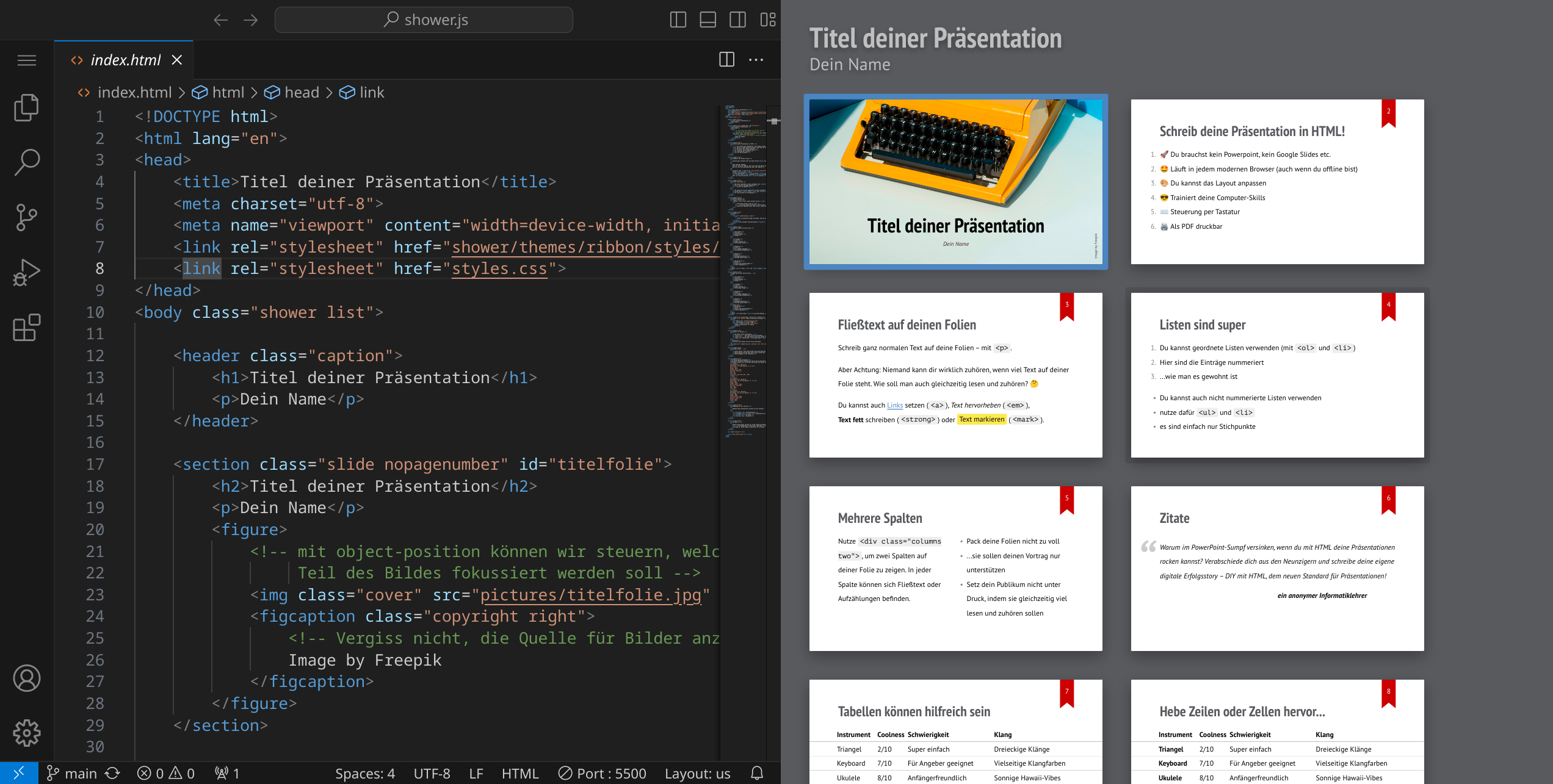 Erstelle eine Präsentation mit shower.js in HTML und CSS. Mach dich unabhängig von PowerPoint und Keynote und erstelle eine Präsentation, die in jedem modernen Browser vom Stick oder von der Cloud aus funktioniert.