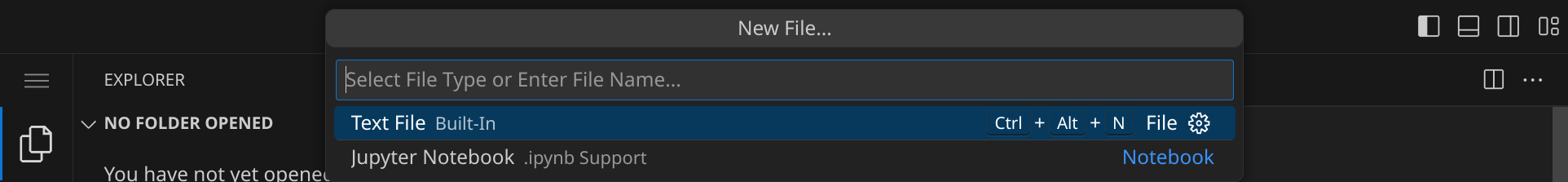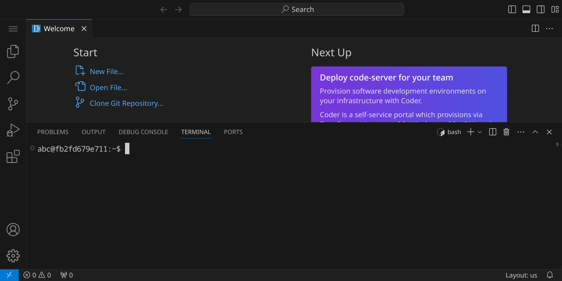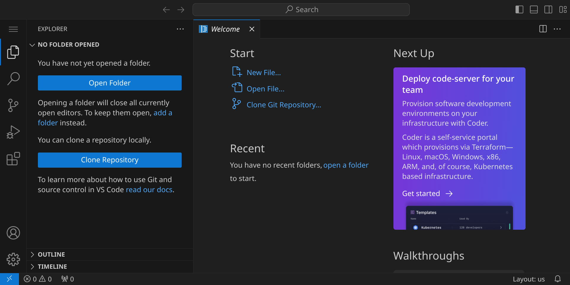 Stelle zuerst sicher, dass du keinen Ordner geöffnet hast. Um sicherzugehen, drücke einfach den Shortcut für »Ordner schließen«: StrgK und dann F. Dein Workspace sollte jetzt ungefähr so aussehen:
