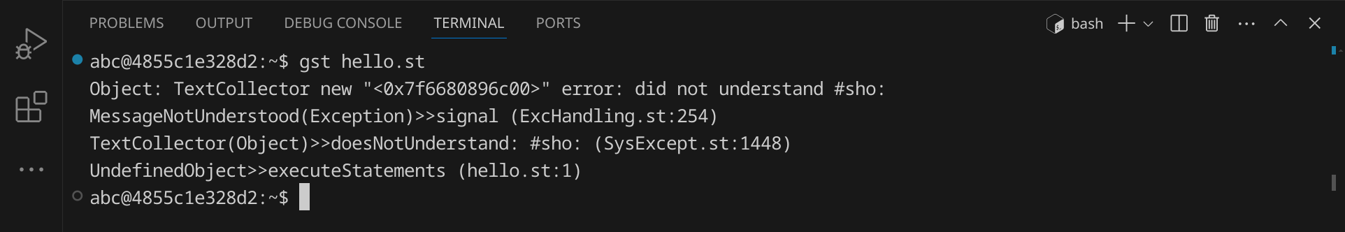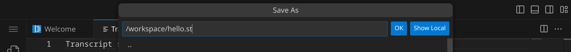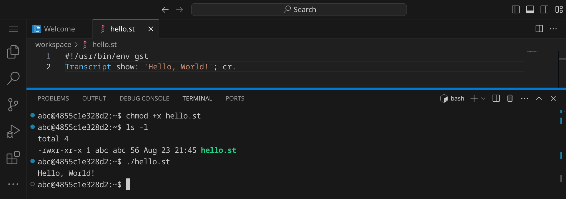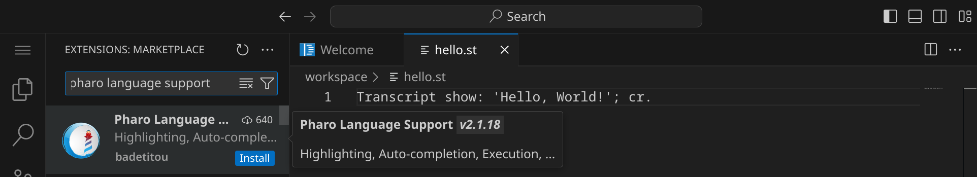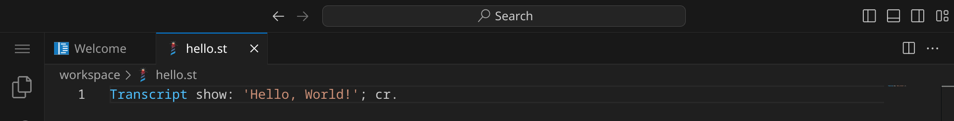 hello.st. (mit einem Punkt am Ende) nennst, da Visual Studio Code als Dateiname Transcript show: 'Hello, World!'; cr. vorschlägt.