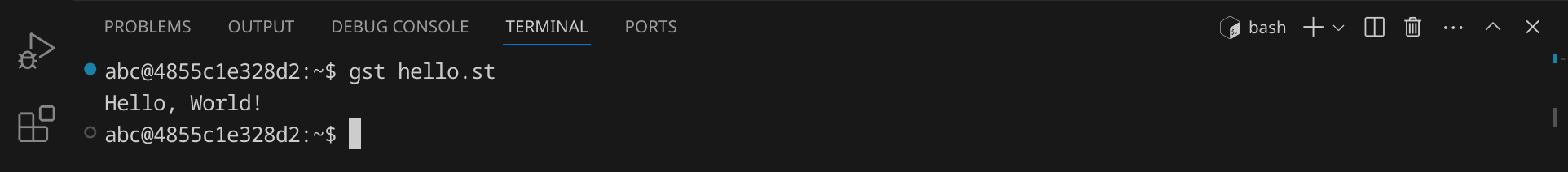 Drücke nun StrgS, um die Datei zu speichern. Gib hello.st ein – der vollständige Pfad zu deiner Datei lautet dann /workspace/hello.st.
