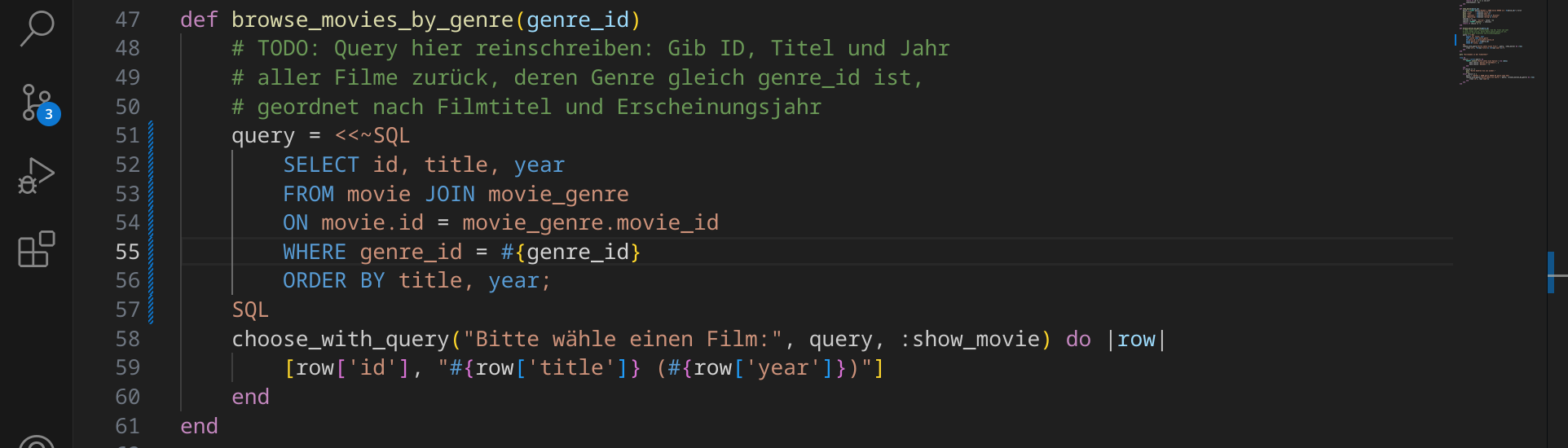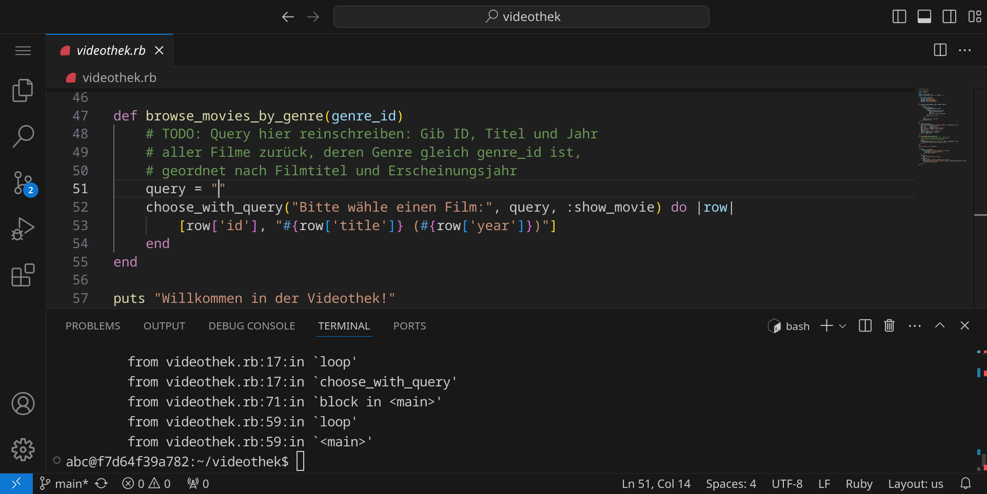 Unsere Abfrage ist nun also fertig und wir können sie in unser Ruby-Programm einfügen. Öffne dazu die Datei videothek.rb und ändere den Code in Zeile 51 wie folgt: