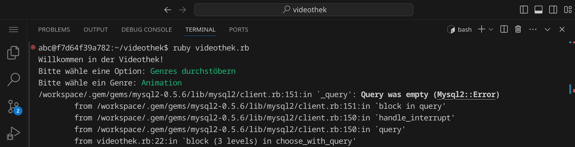 Die erste Zeile gibt dir einen Hinweis darauf, was überhaupt passiert ist. »Query was empty« bedeutet, dass eine leere Anfrage an die Datenbank gesendet wurde. In der Datei videothek.rb findest du die fehlerhafte Stelle in Zeile 51: