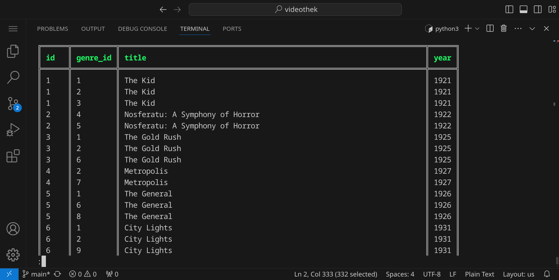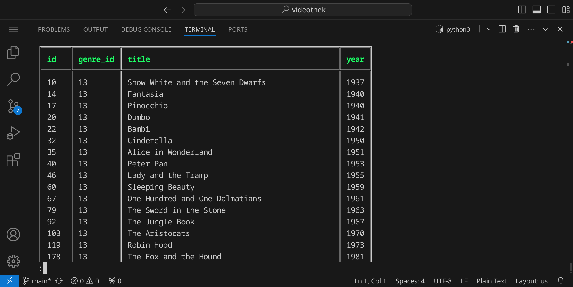 Da wir uns nur für die Spalten id, titel und year interessieren, können wir die Abfrage entsprechend anpassen. Zusätzlich zur ID des Films interessiert uns auch die ID des Genres, um später die Filme nach Genres filtern zu können: