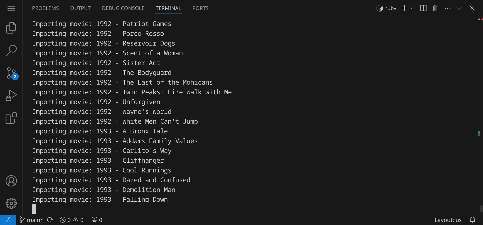 Um die Tabellen mit Daten zu füllen, verwenden wir das Ruby-Skript import-data.rb. Dieses Skript liest die Textdateien movies.txt und genres.txt und fügt die Daten in die Datenbank ein.