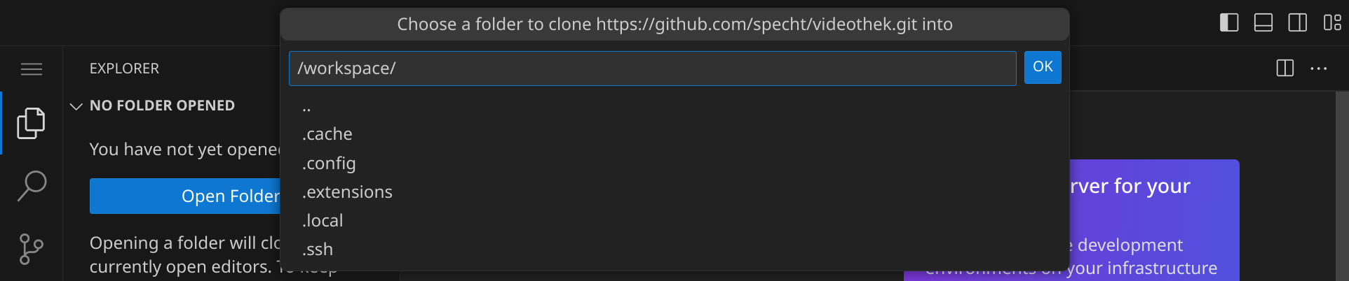 Als nächstes musst du angeben, in welches Verzeichnis du das Repository klonen möchtest. Bestätige den Standardpfad /workspace/ mit Enter.