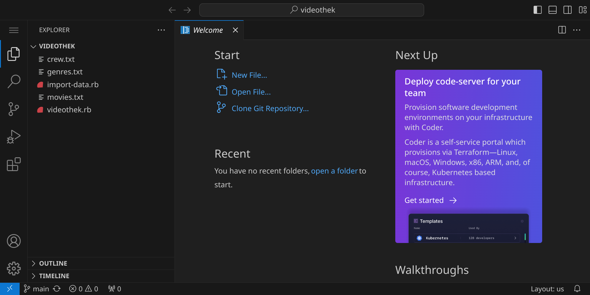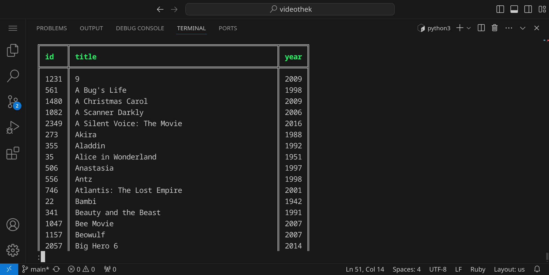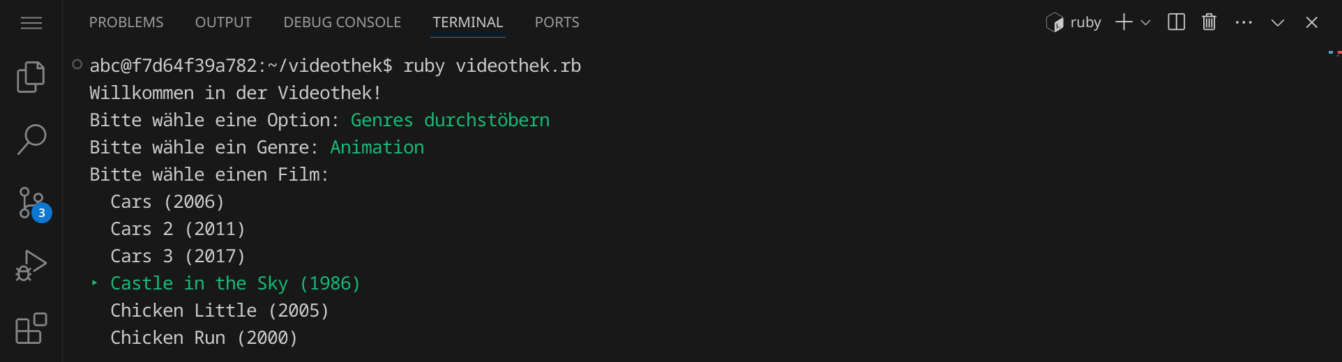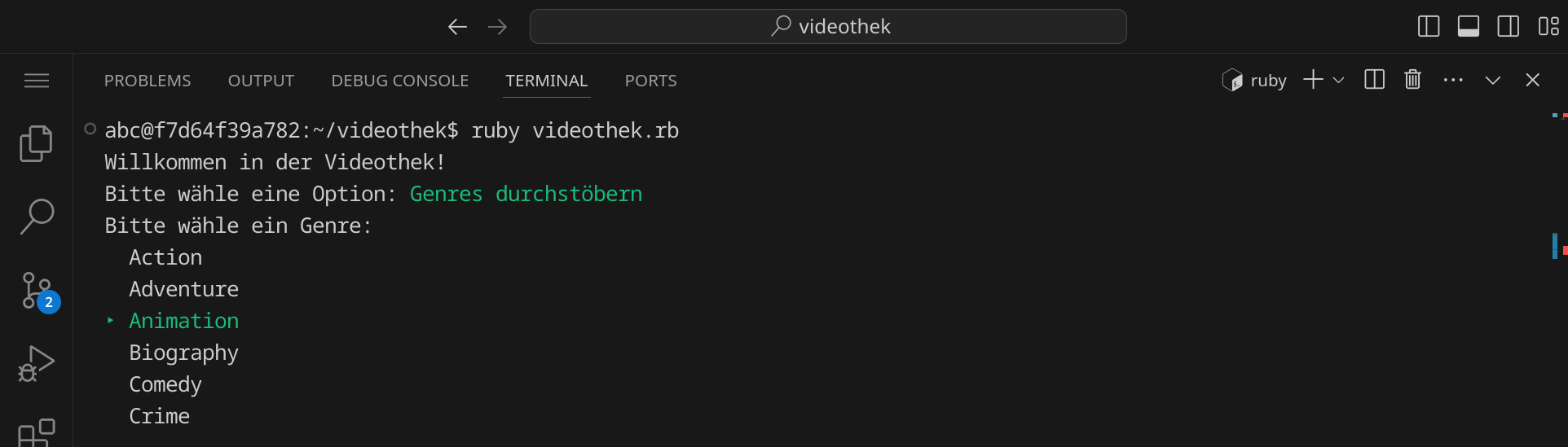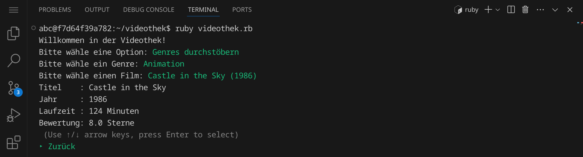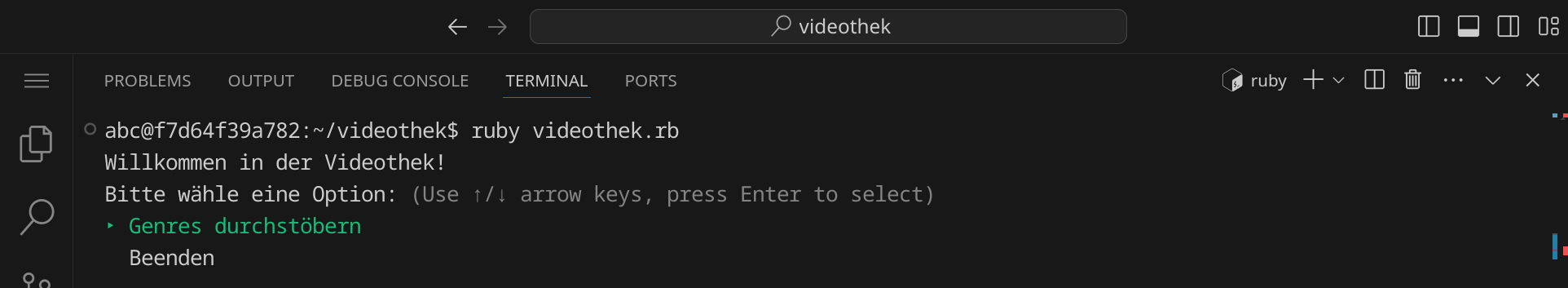 Führe anschließend das Skript videothek.rb im Terminal aus: