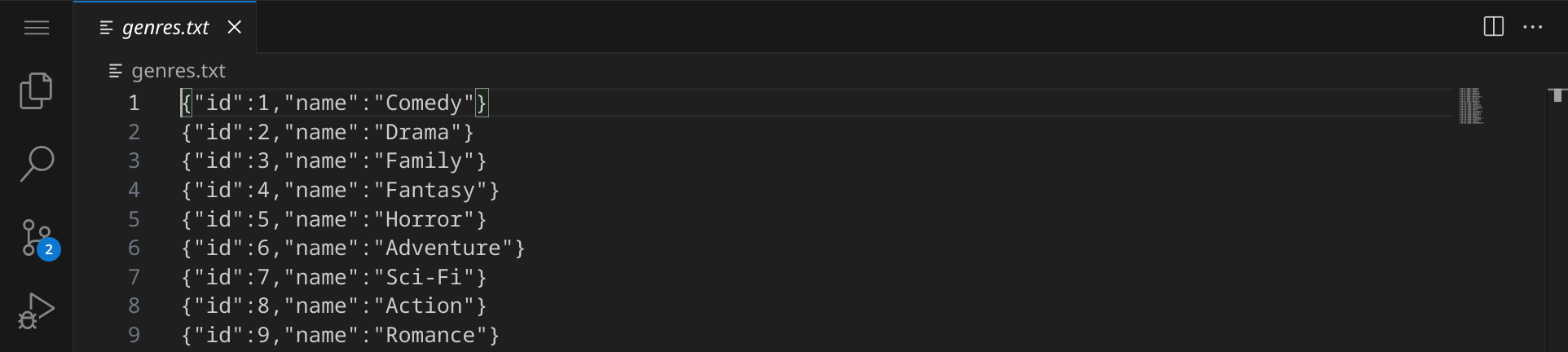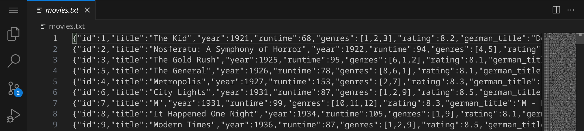 In jeder Zeile siehst du einen Datensatz, der ein Genre beschreibt und im JSON-Format vorliegt. Die Datei movies.txt enthält ähnliche Daten, die Filme beschreiben: