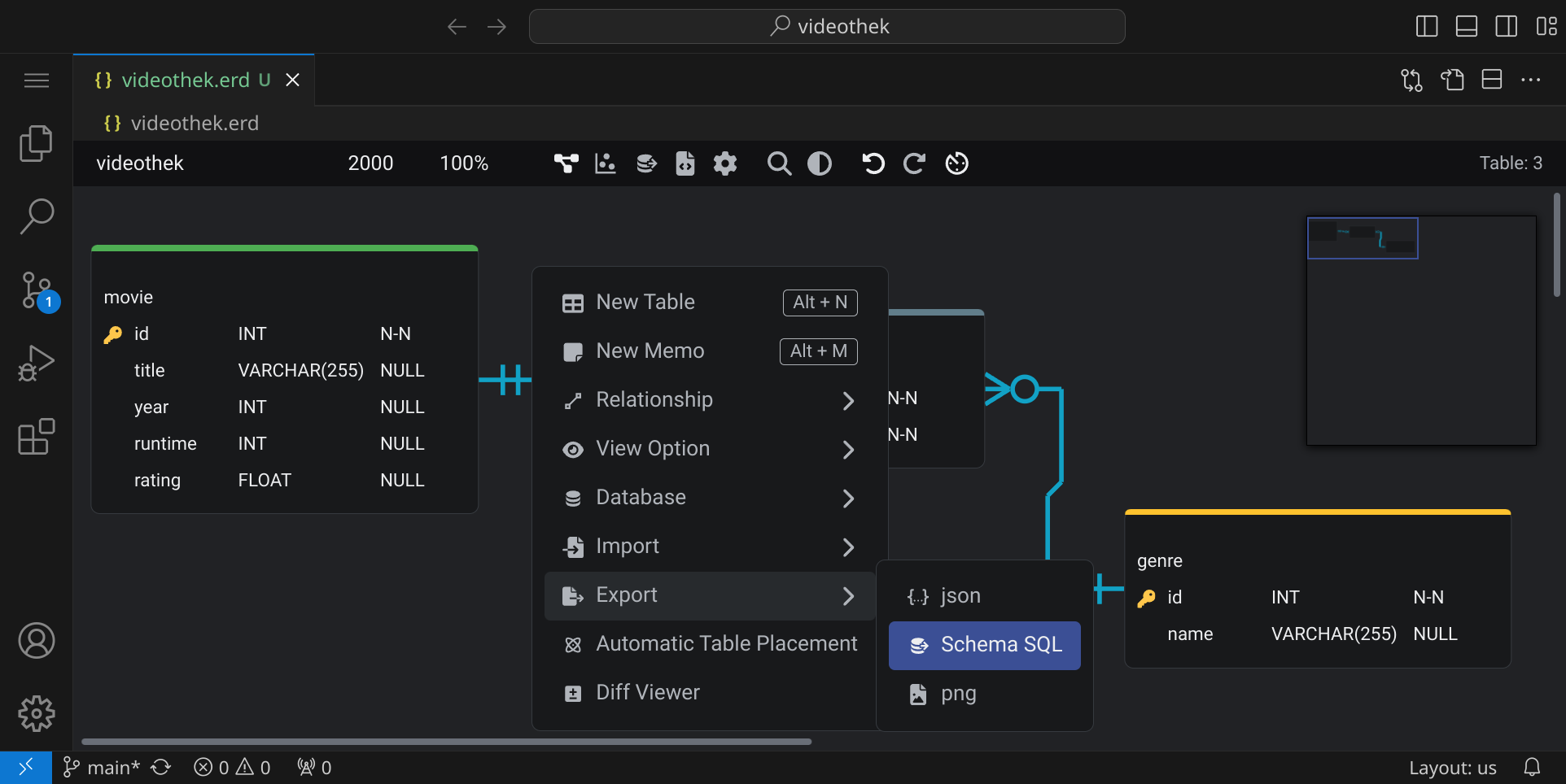 _).movie_genre entstehen automatisch, wenn du die Beziehung zwischen den Tabellen movie und genre herstellst (Fremdschlüssel sind pink markiert).id heißen, musst du sie in movie_id und genre_id umbenennen, damit es keine Verwechslungen gibt.movie_genre zusätzlich als Primärschlüssel, sie sollten dann blau dargestellt werden.N-N steht für »NOT NULL« und bedeutet, dass der Wert nicht leer sein darf.Wenn du fertig bist, kannst du das Diagramm speichern und den SQL-Code exportieren, den wir später verwenden werden, um die Datenbankstruktur zu erstellen. Klicke dazu mit rechts auf den Hintergrund und wähle »Export« / »Schema SQL«.