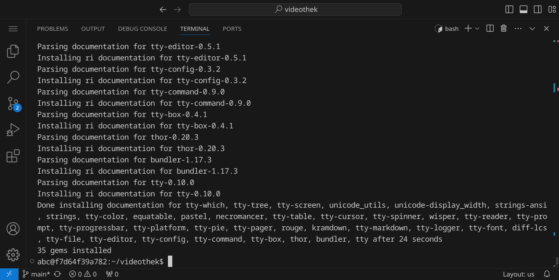 Bevor wir das Hauptprogramm videothek.rb starten können, müssen wir noch das Rubygem tty installieren (es handelt sich dabei um eine Familie von Rubygems, die es ermöglichen, interaktive Konsolenanwendungen zu erstellen). Öffne dazu ein Terminal und gib folgenden Befehl ein: